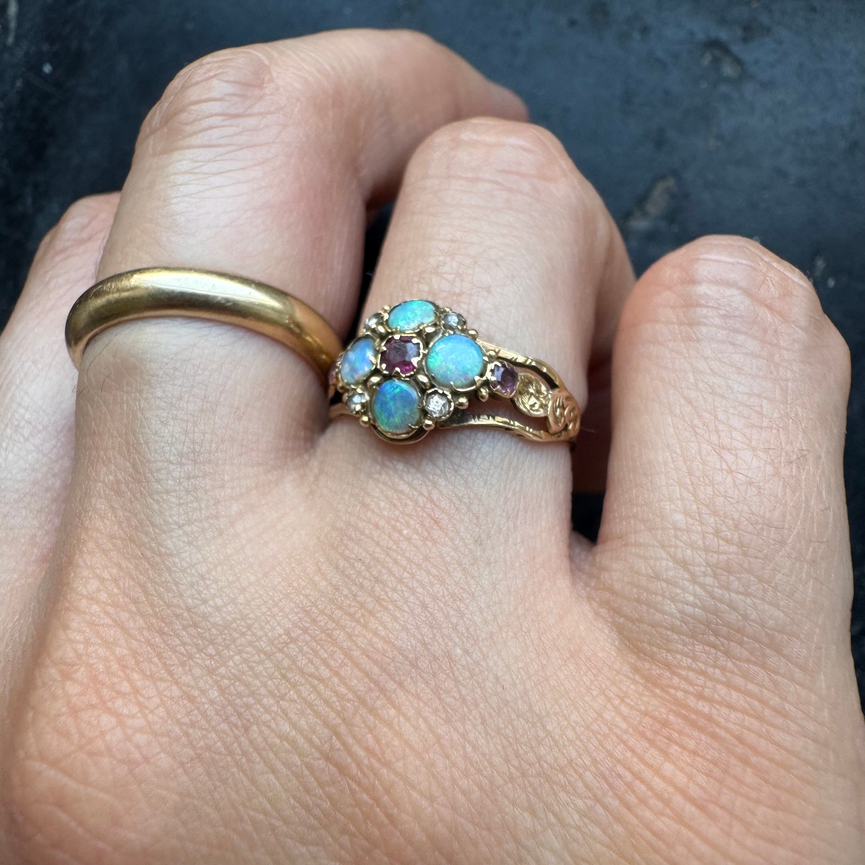 石座には細かい粒々でデコレーション、アームには透かしデザインに彫金が施されています。この時代のジュエリーにはいろんな石をセットされている事が多くコレクションに加えたくなるアンティークジュエリーの一種です。
