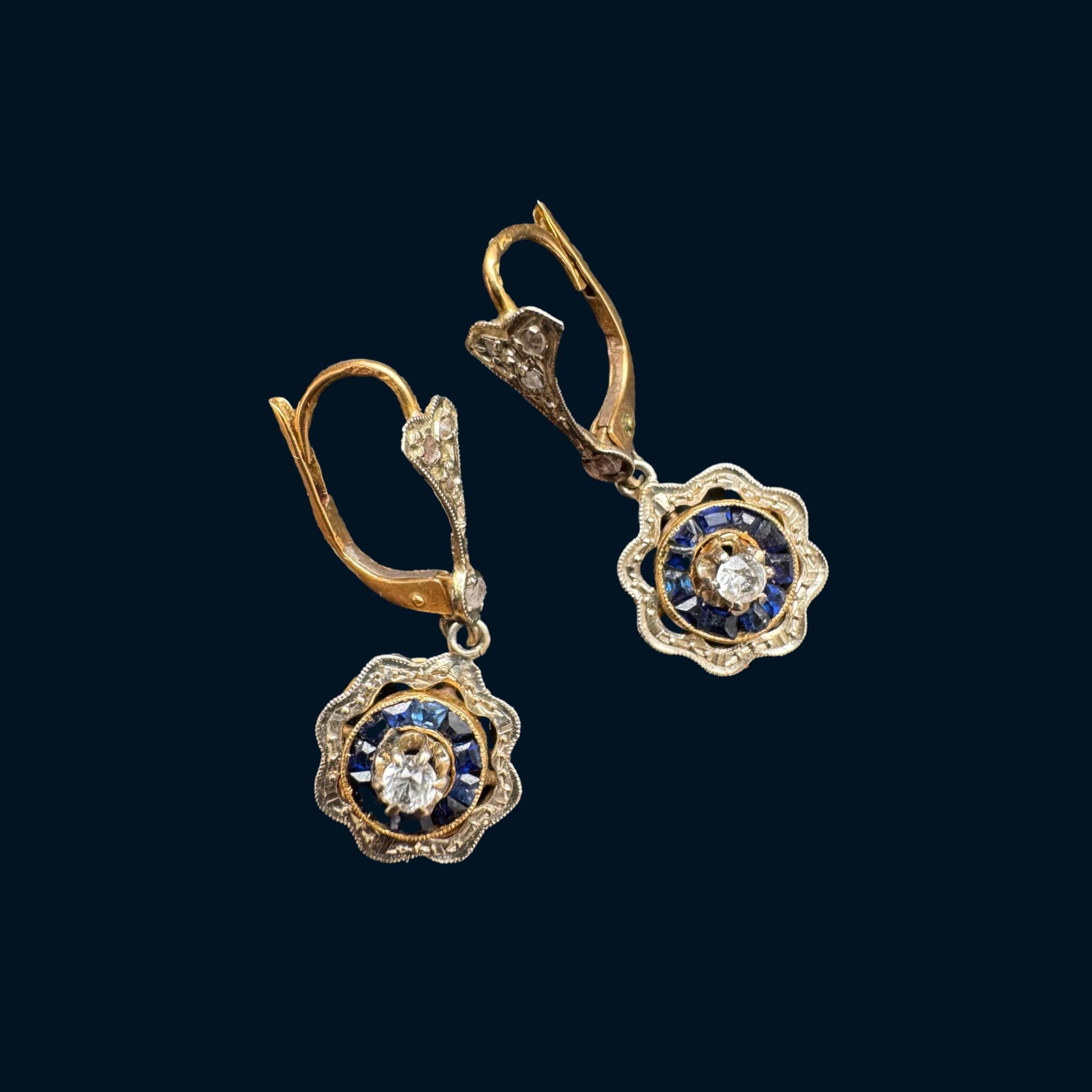 フラワーベースの透かしデザインに典型的なアールデコを表現するようにカリブレカットのサファイヤがセットされています。ひらひらとした表面には細かいミル打ちが施され石がセットされているような輝きもあります。ありそうでない、なかなか仕入れ困難な一品です。