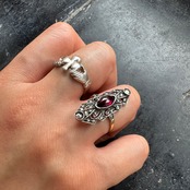 散りばめられたローズカットダイヤモンドとカボションカットガーネットがセットされたクラシックなフランスのアンティークリングのご紹介です。縦長いデザインは手先をより美しく見せてくれ、透かしの彫金の隙間を埋めるようにダイヤモンドがセットさたリングが手の動きとともに輝きを増します。