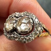贅沢に2石の大粒のダイヤを無数の石で包まみ、石座にはシルバーが使用されていることでよりダイヤモンドが大き見えます。