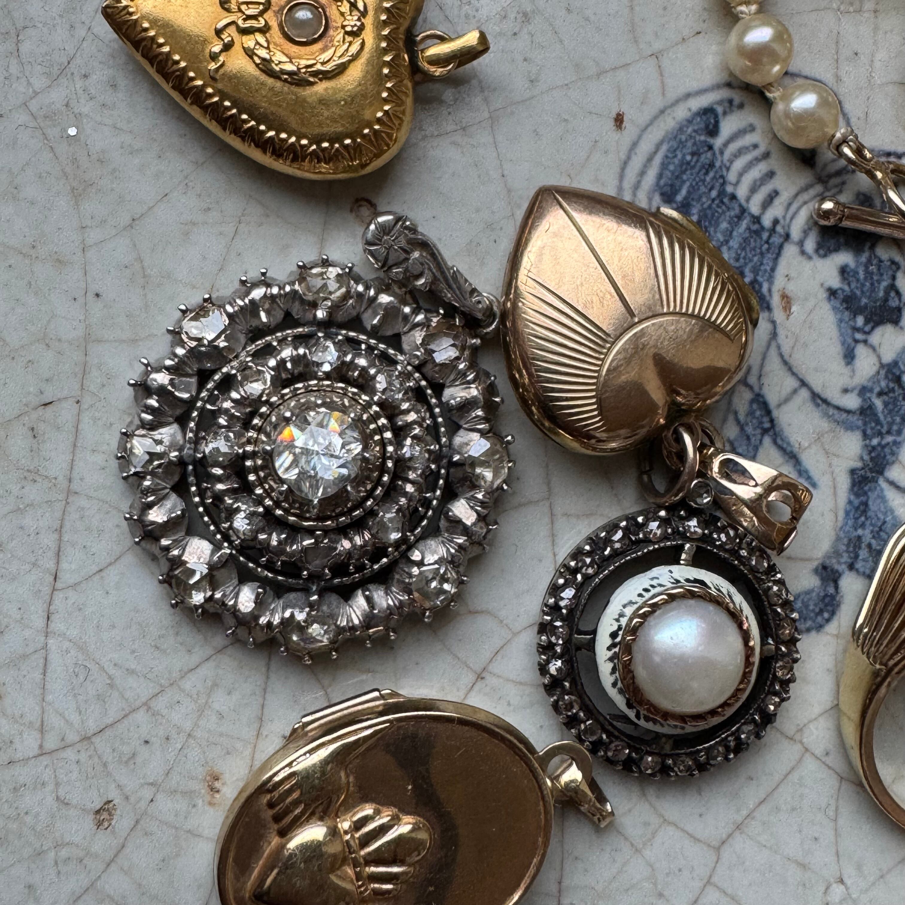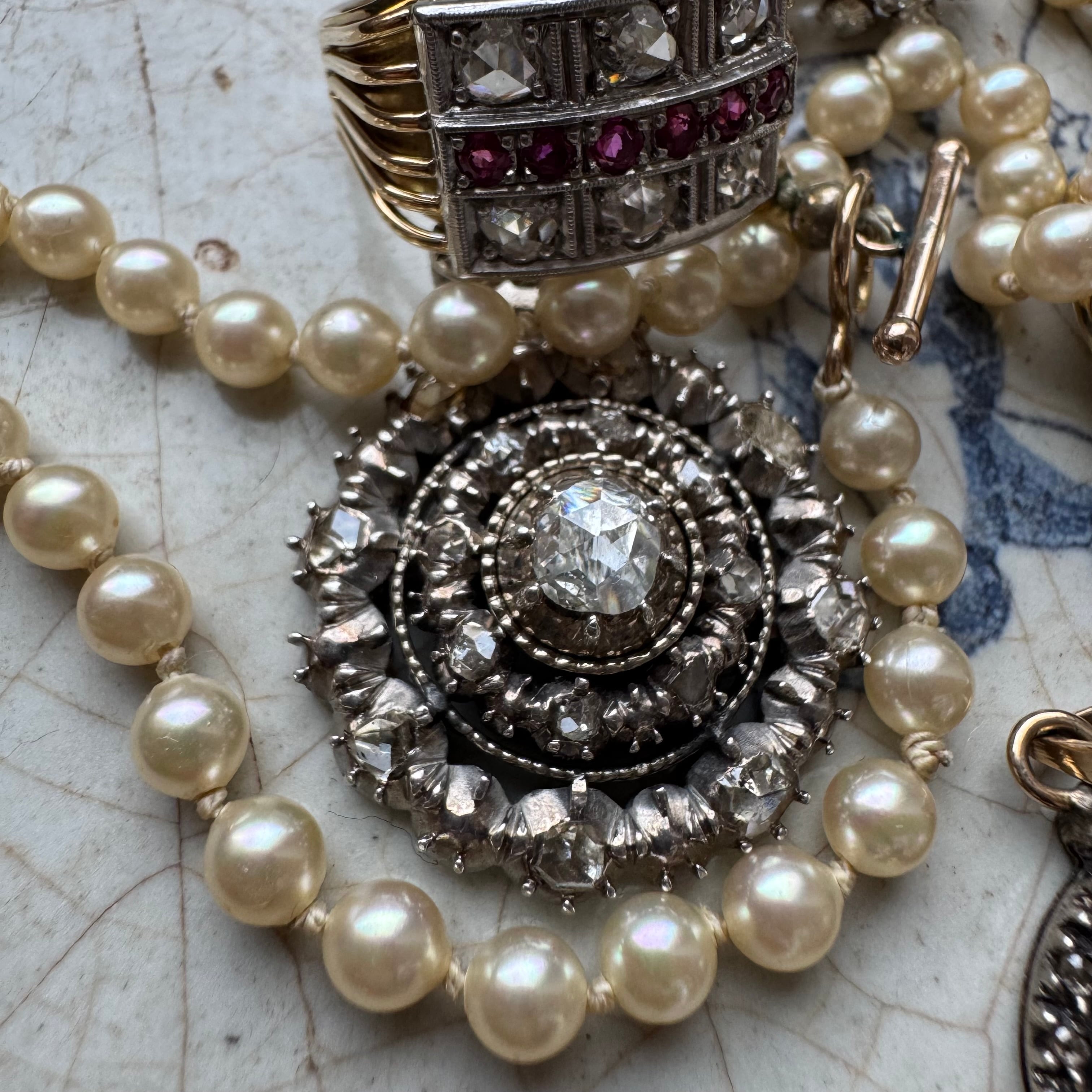 雪の結晶のようなデザインで煌めくローズカットが無数にセットされ、細かいミル打ちに魅了された一品です。