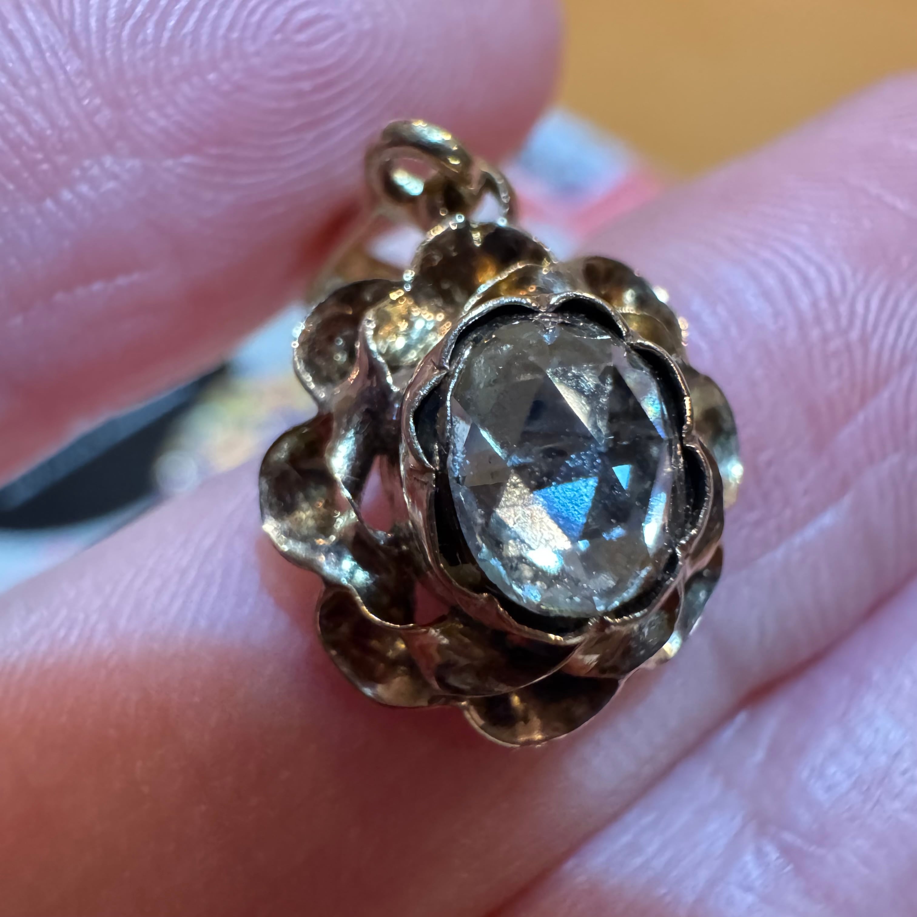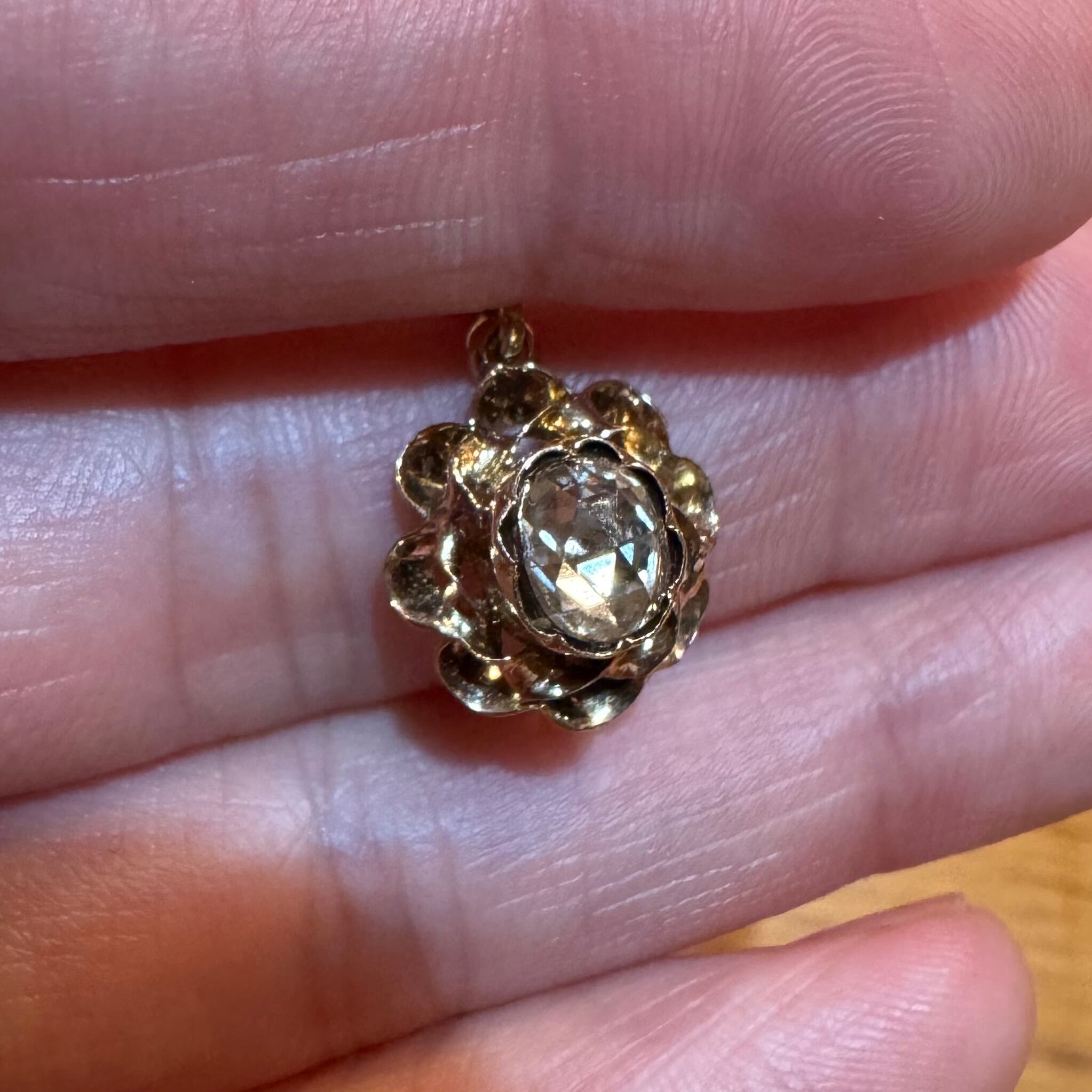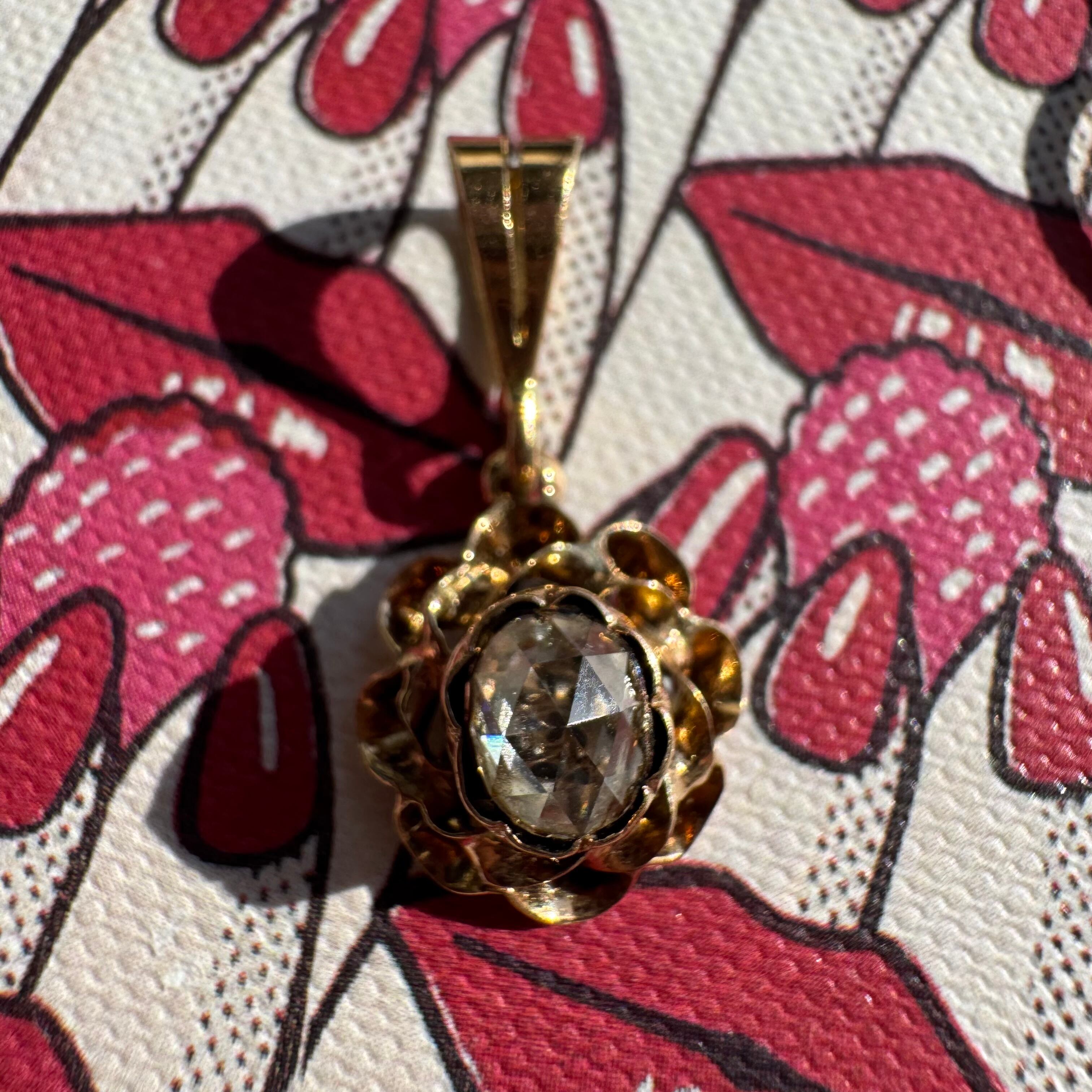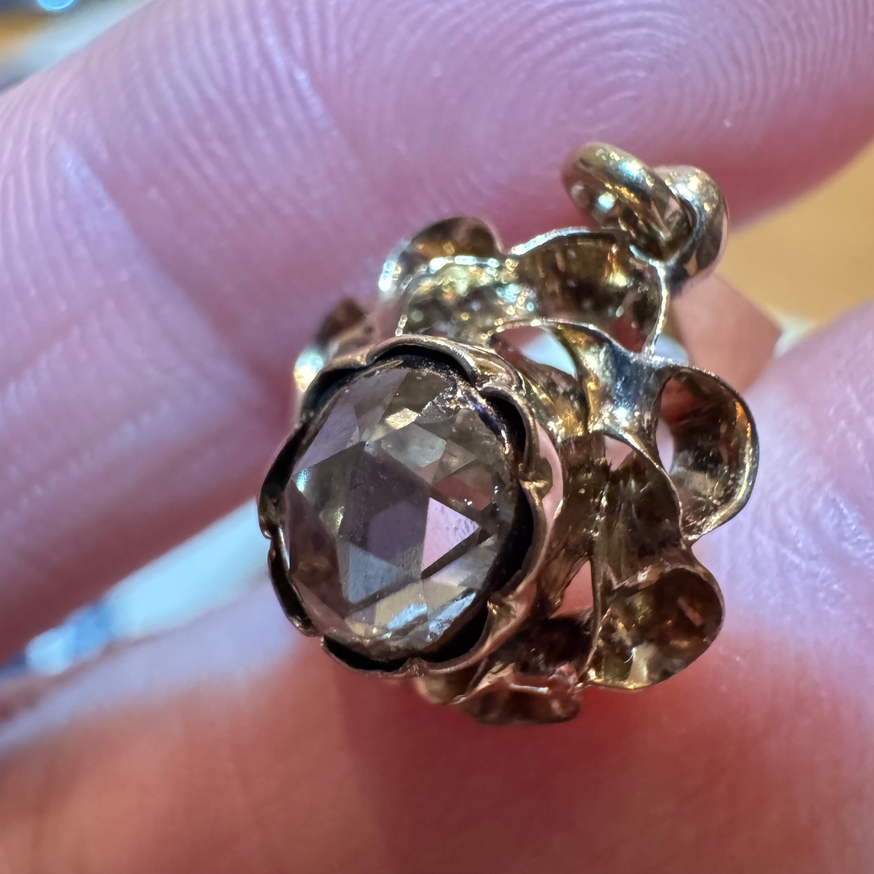 ボリュームのあるバターカップ(菊座)のひらひらした彫金が薔薇のよう魅了的で、その上に大粒のダイヤモンドがセットされ高さと立体感があり、センスの良い一品です。