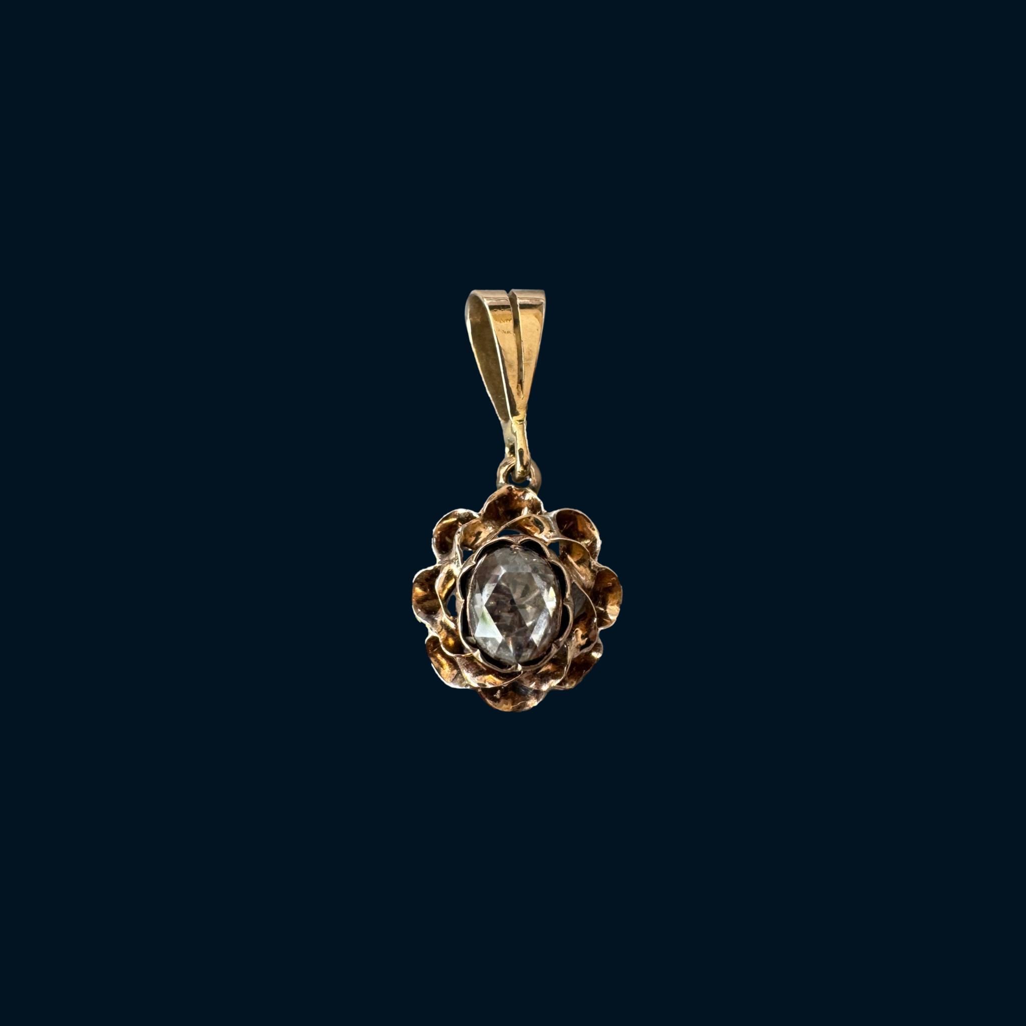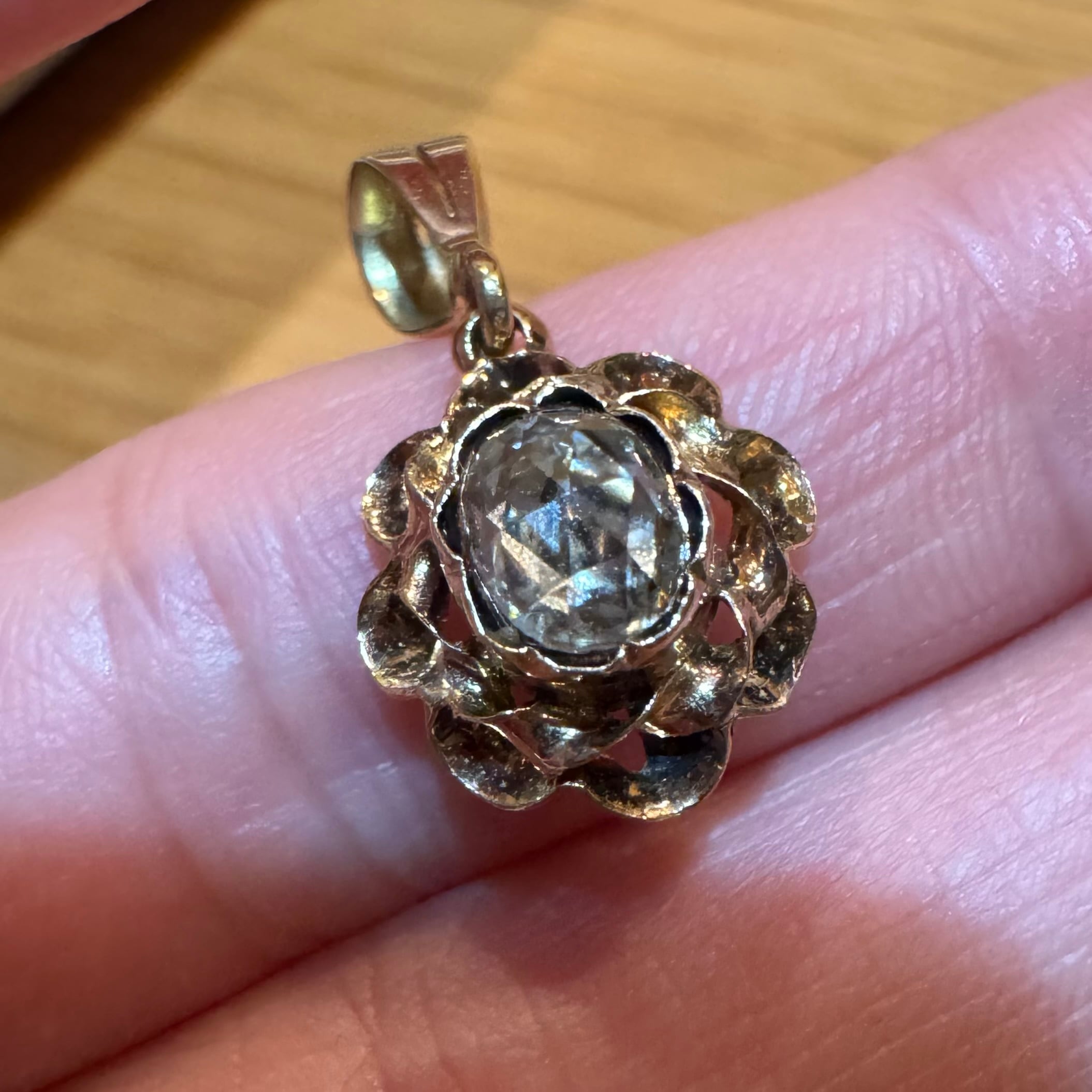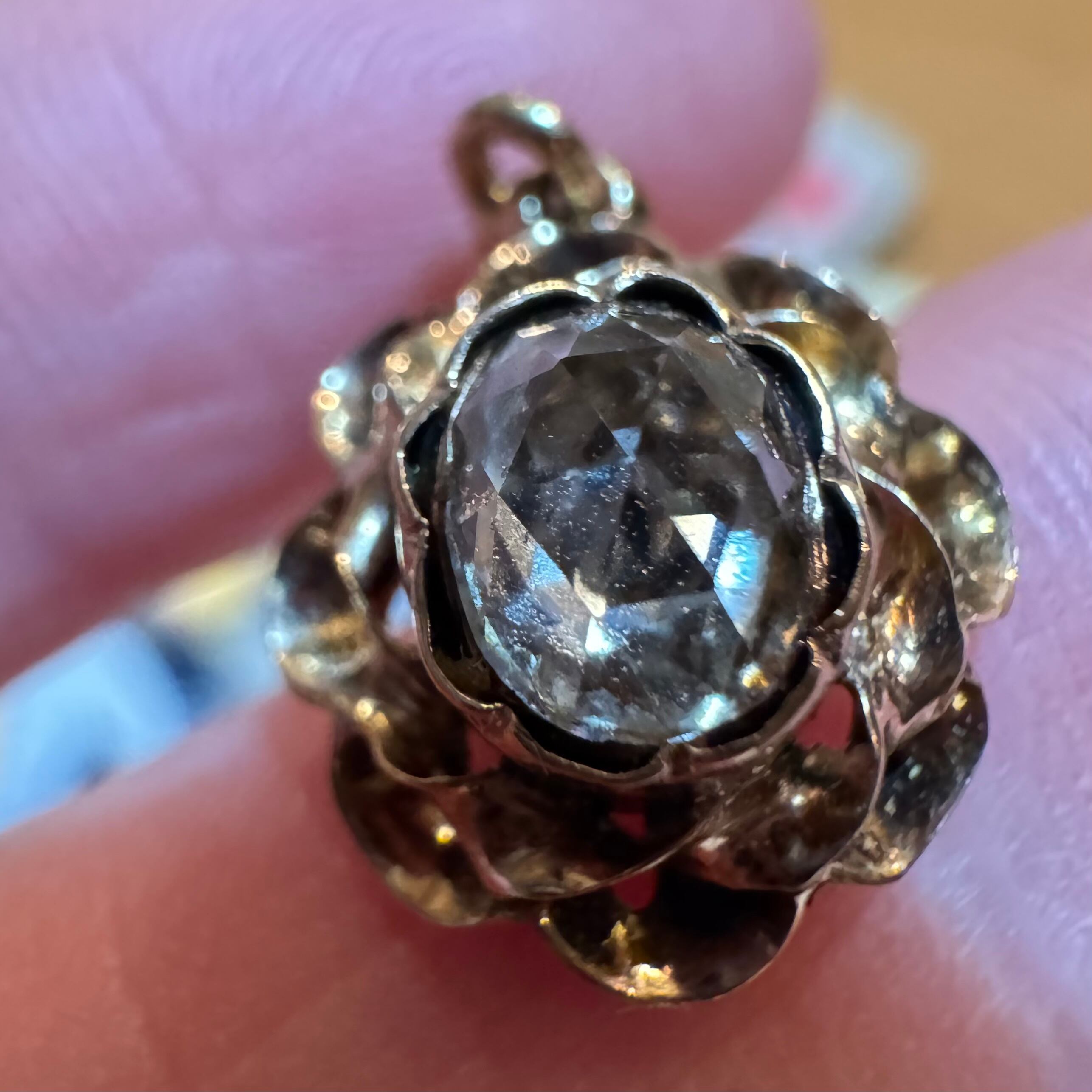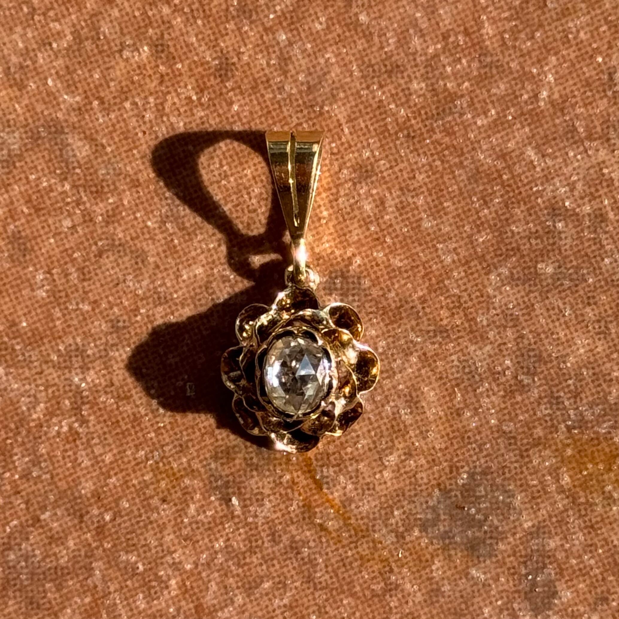 ボリュームのあるバターカップ(菊座)のひらひらした彫金が薔薇のよう魅了的で、その上に大粒のダイヤモンドがセットされ高さと立体感があり、センスの良い一品です。
