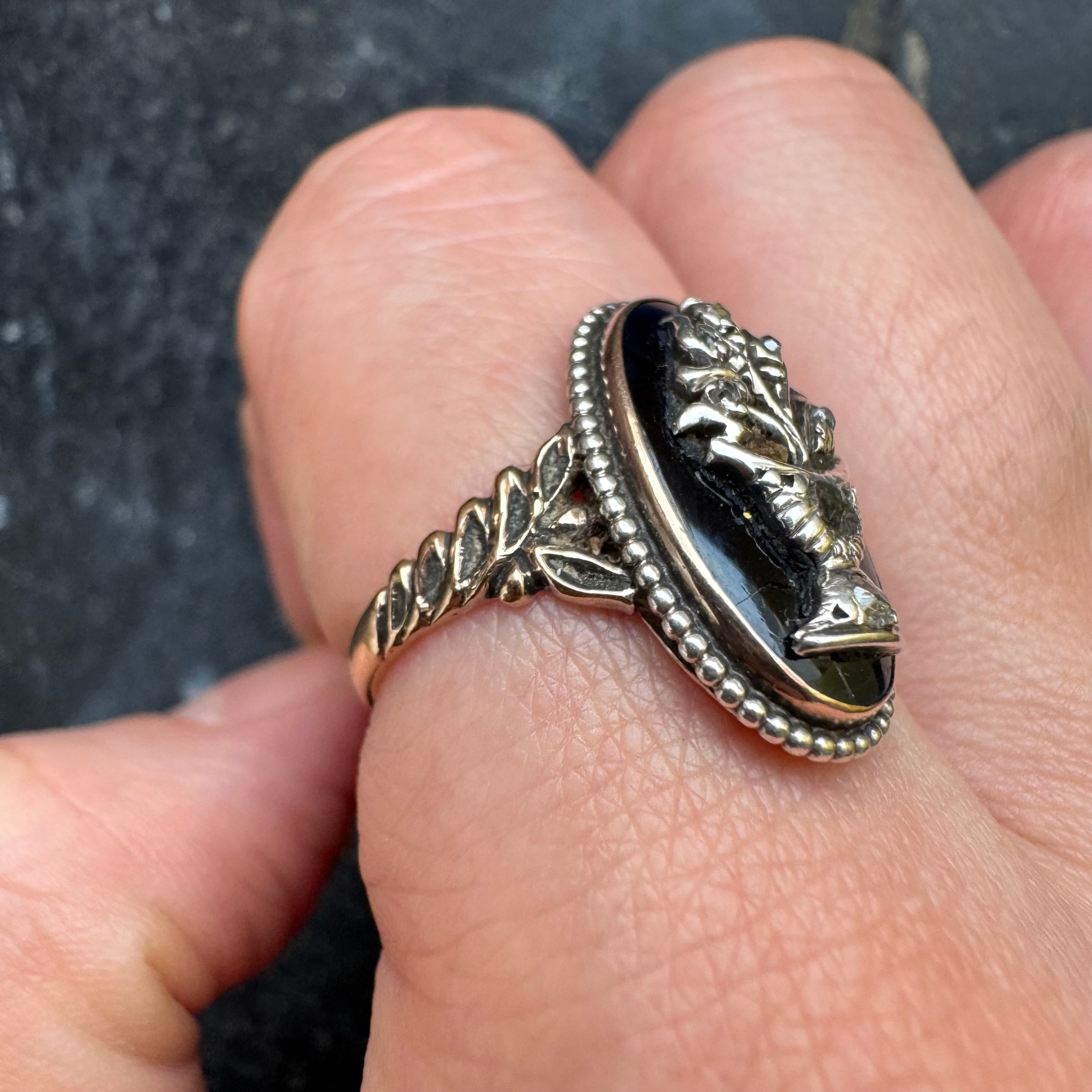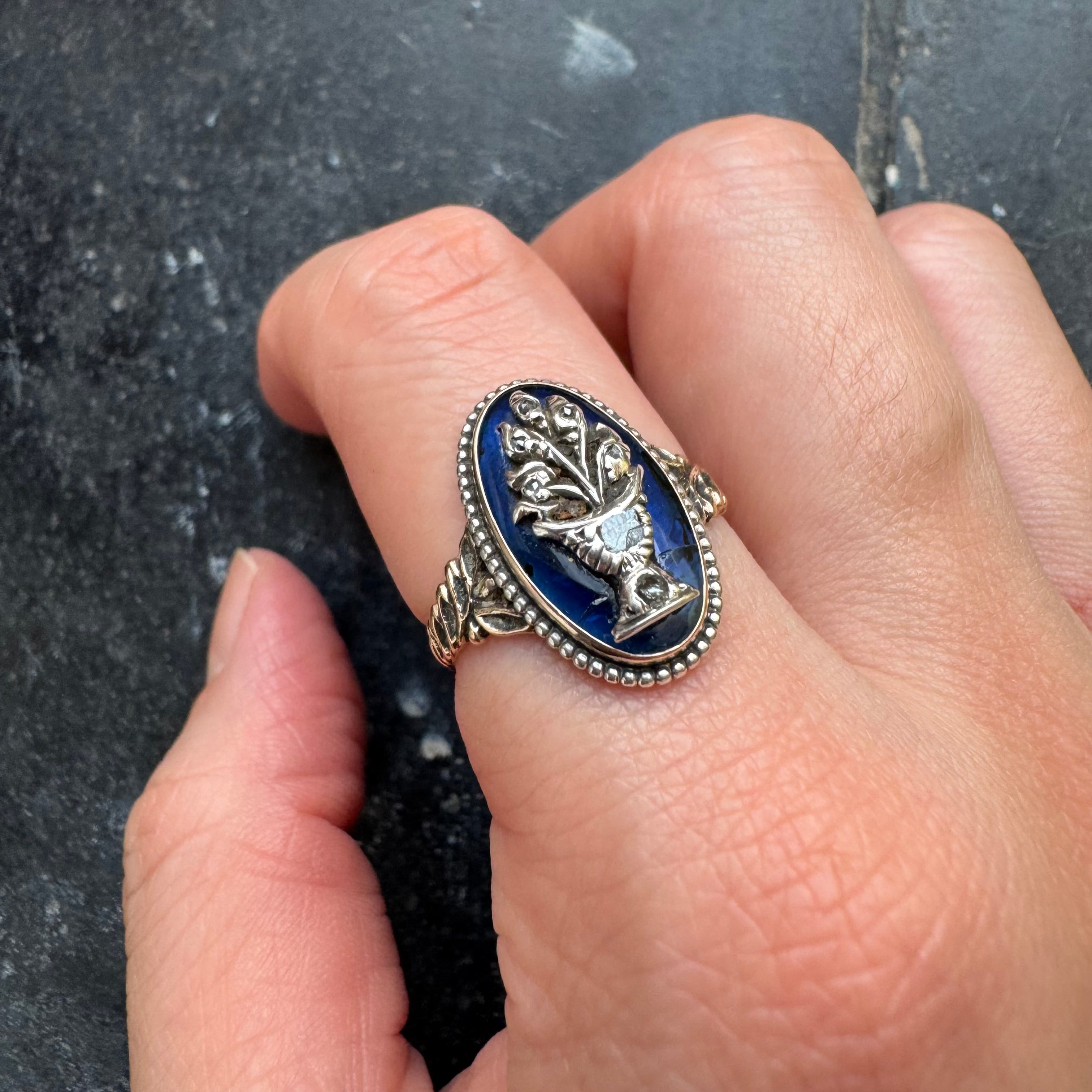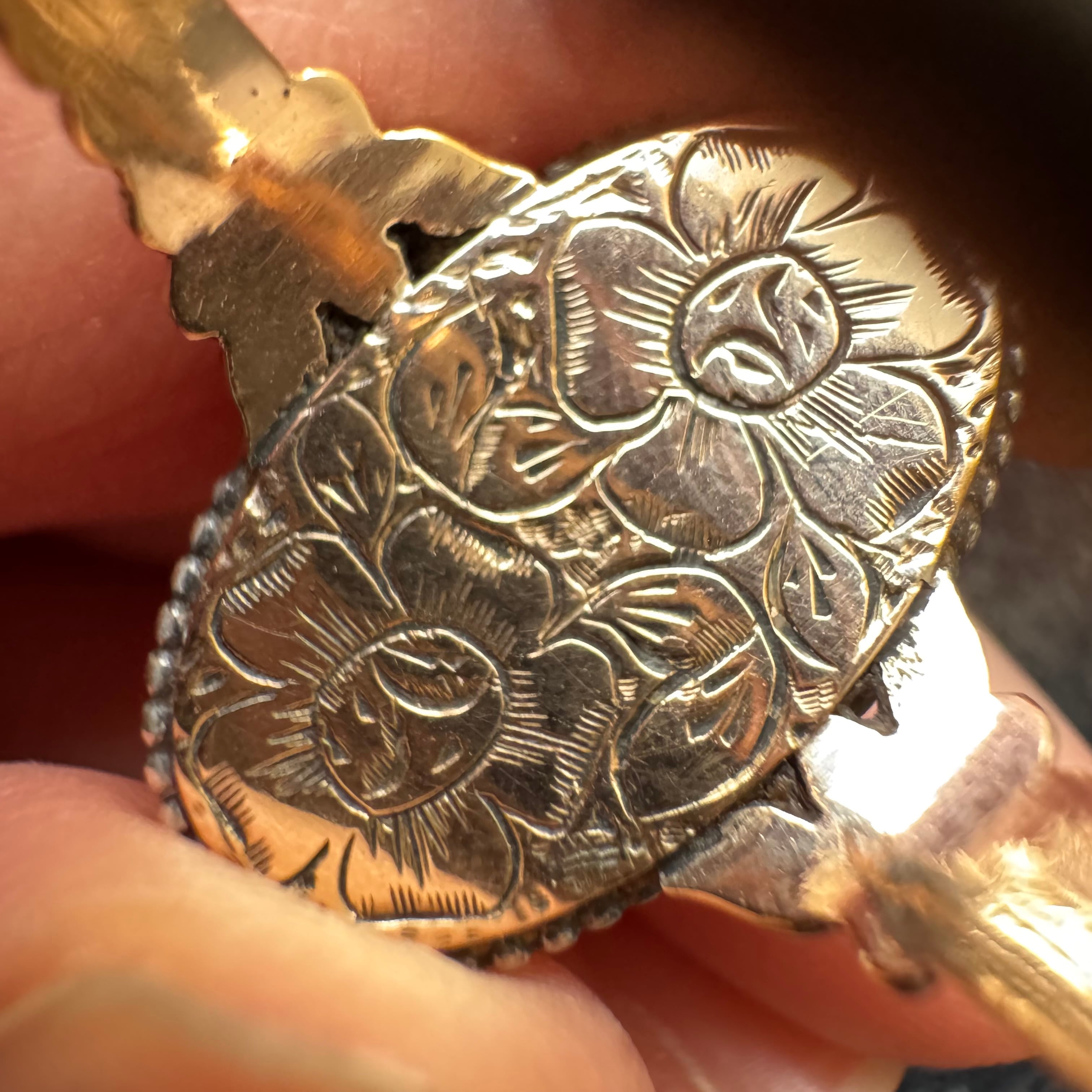 ミニチュアの絵画がリングに落とし込んだかのような見事な彫金に、ローズカットダイヤモンドがセットされています。表面のデザインも素晴らしい品ですが状態が万全とは言えない中、私は背面のフローラル彫金に強く心を奪われ仕入れてまいりました。