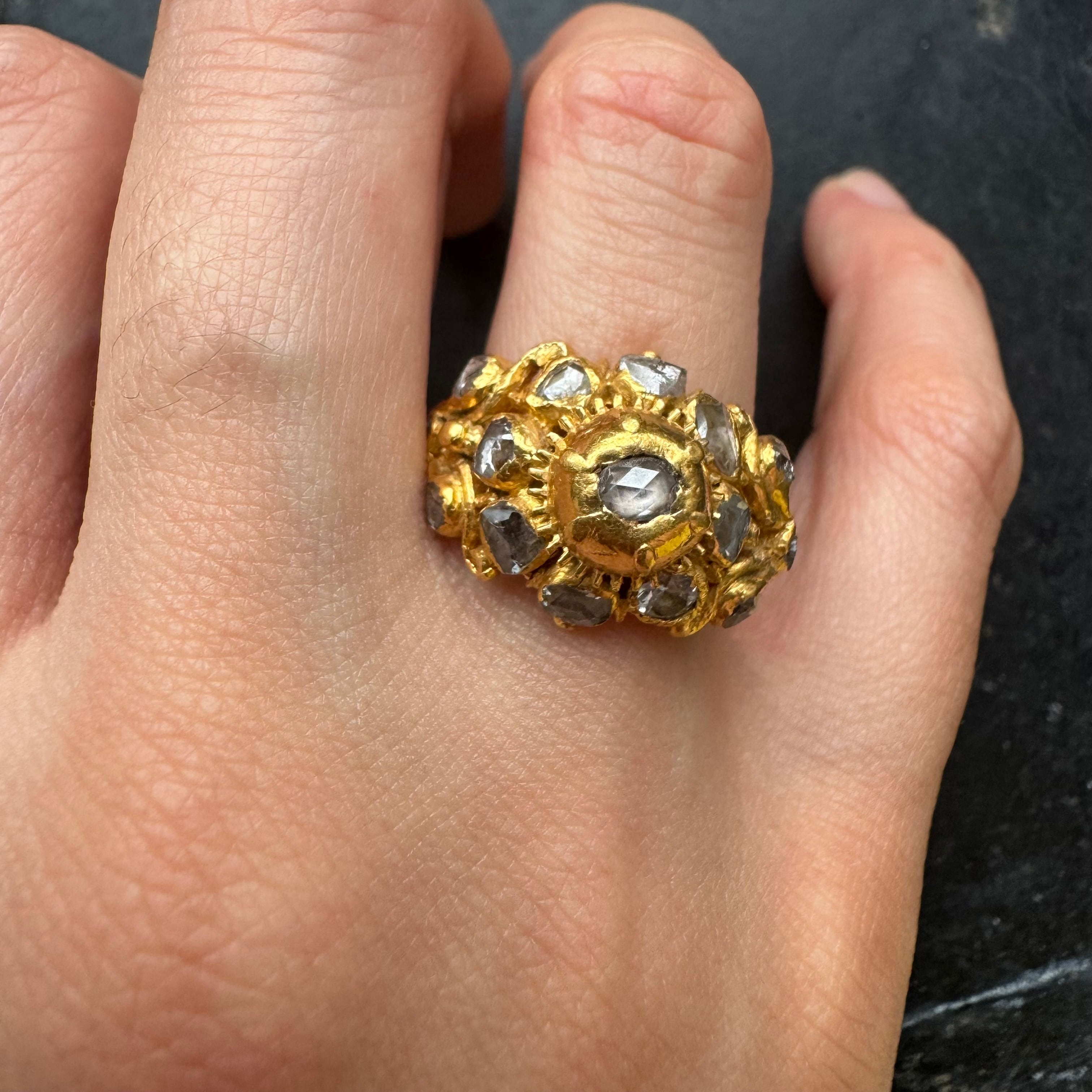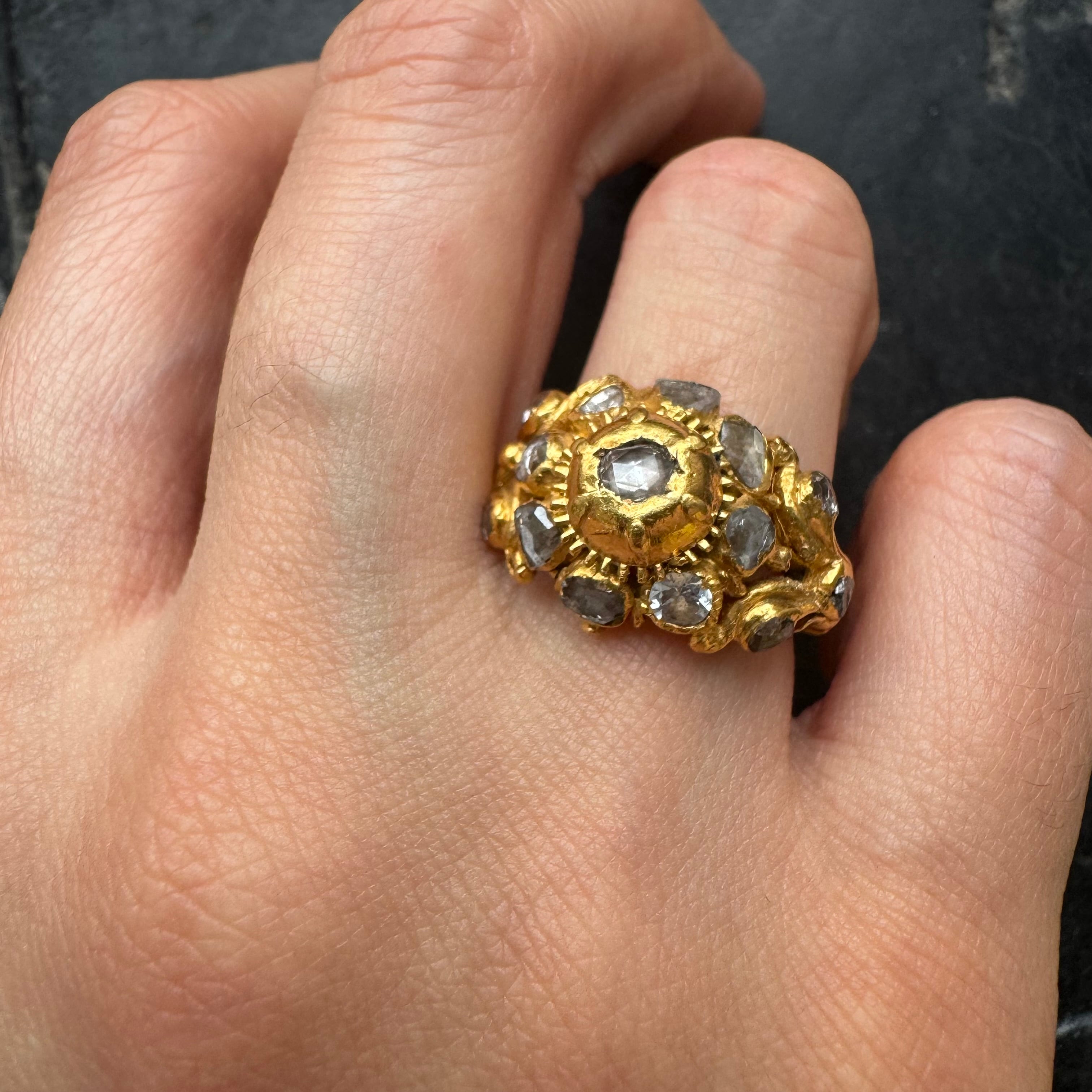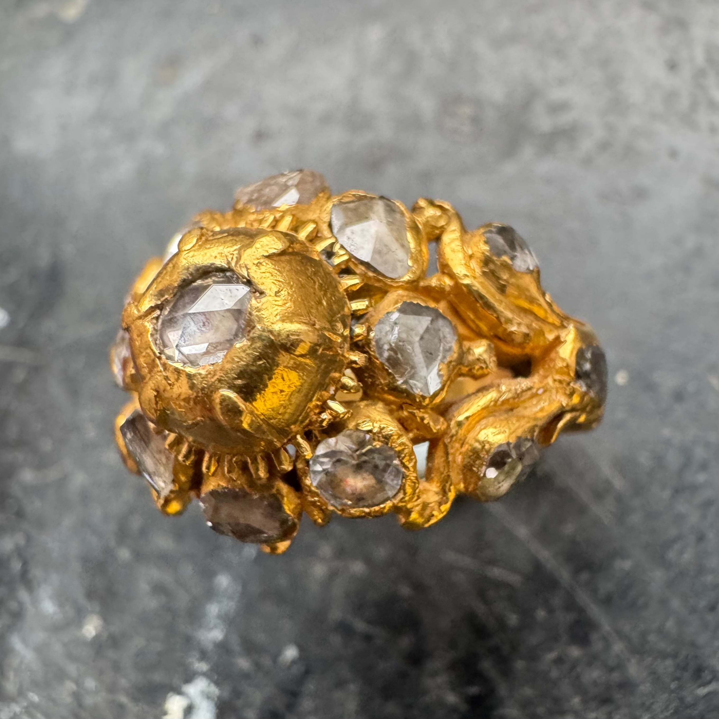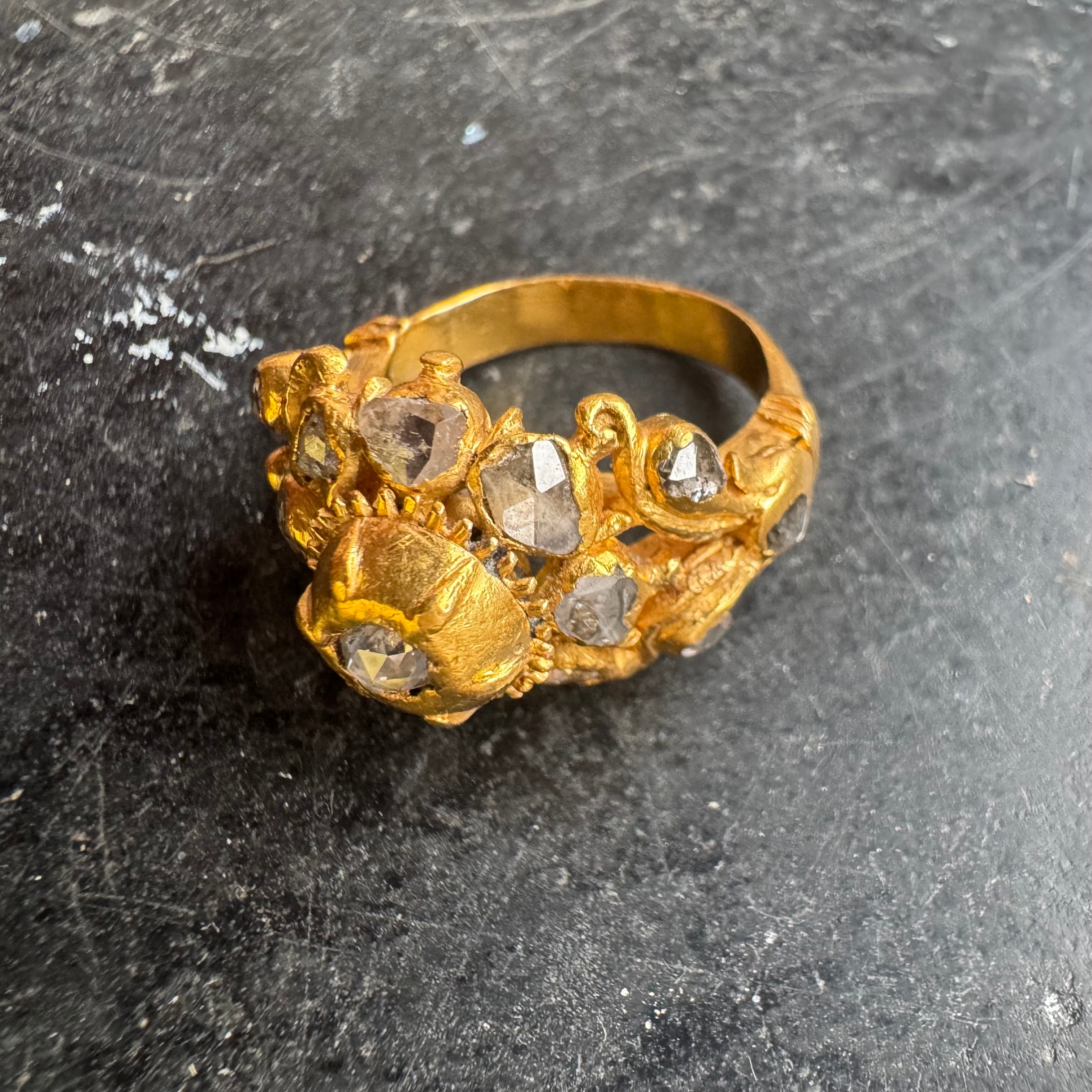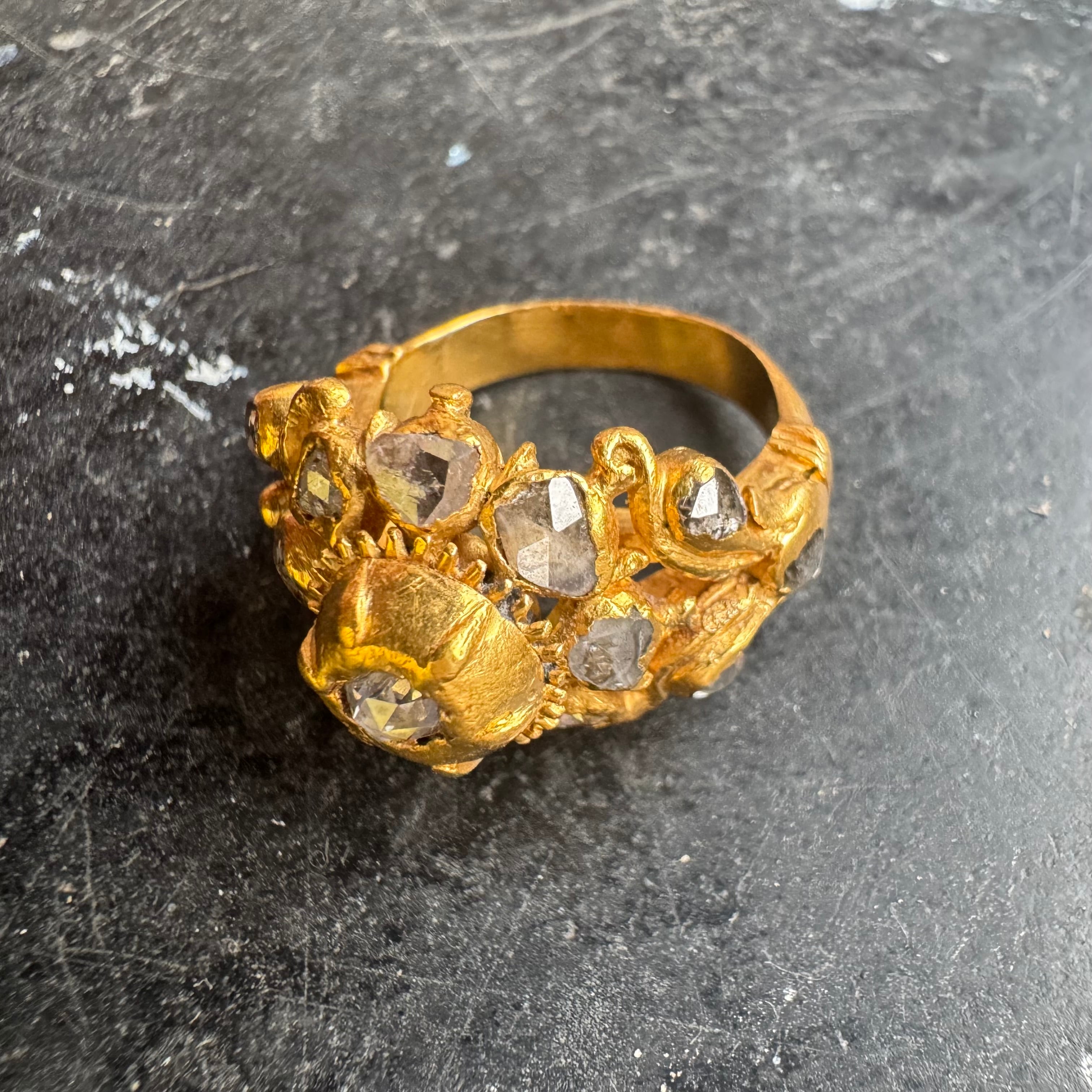 透かしと立体感のあるデザインに古いローズカットダイヤモンドがセットされ歪な彫金が施された古色風リバイバルにみられる逸品です。