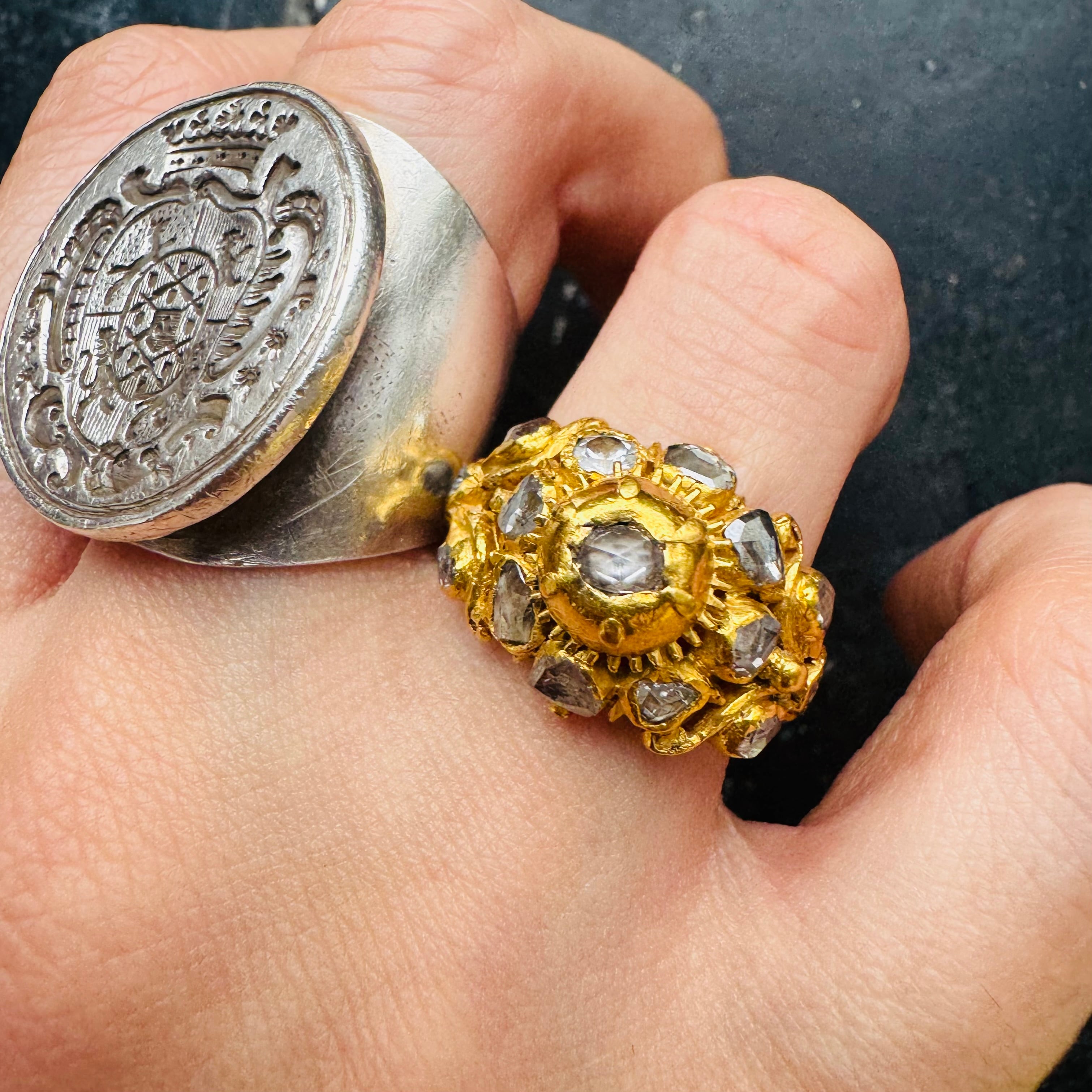 一目惚れして仕入れたこちらの作品は当時のカンボジア王からフランス人官僚に贈られたリングという来歴のあるリングです。