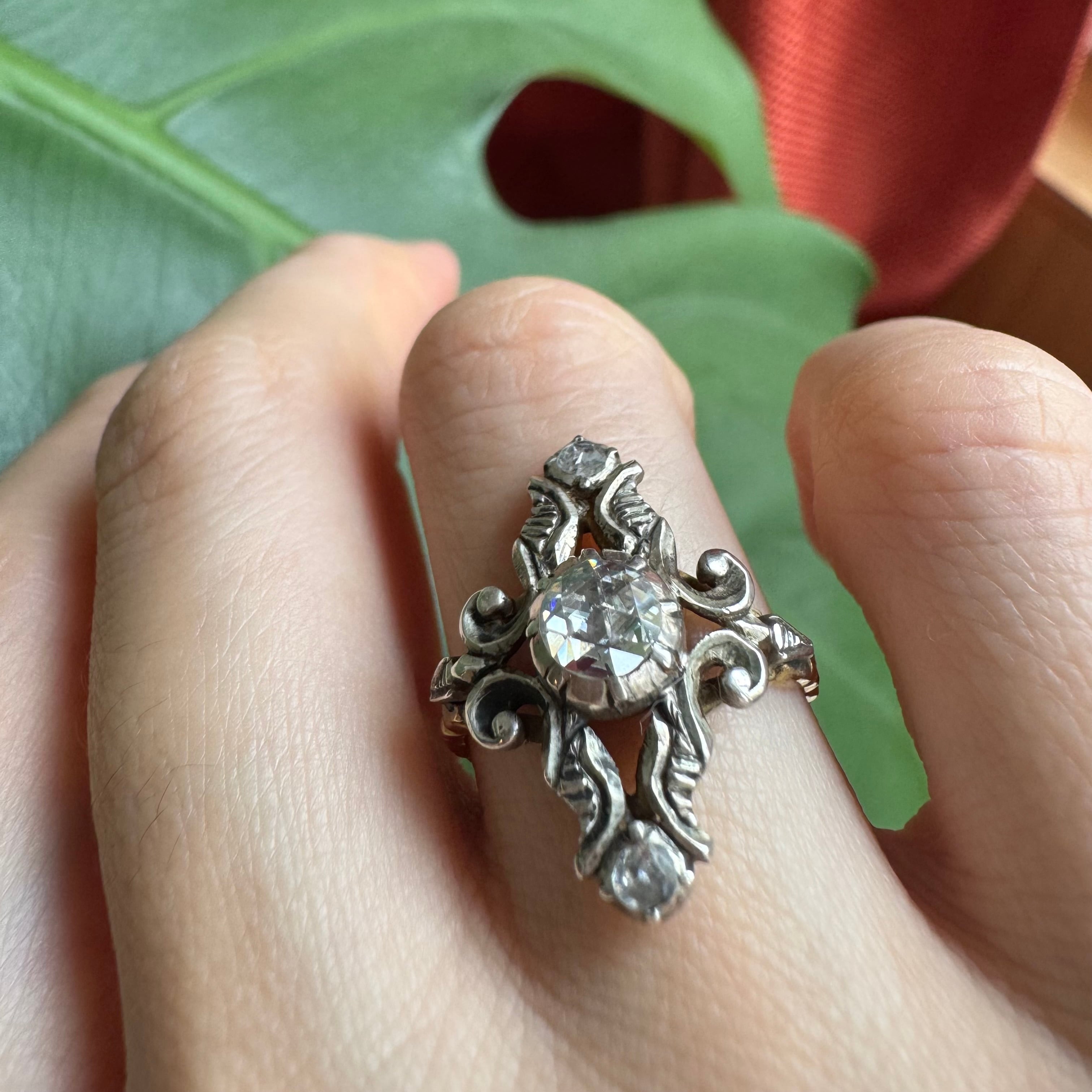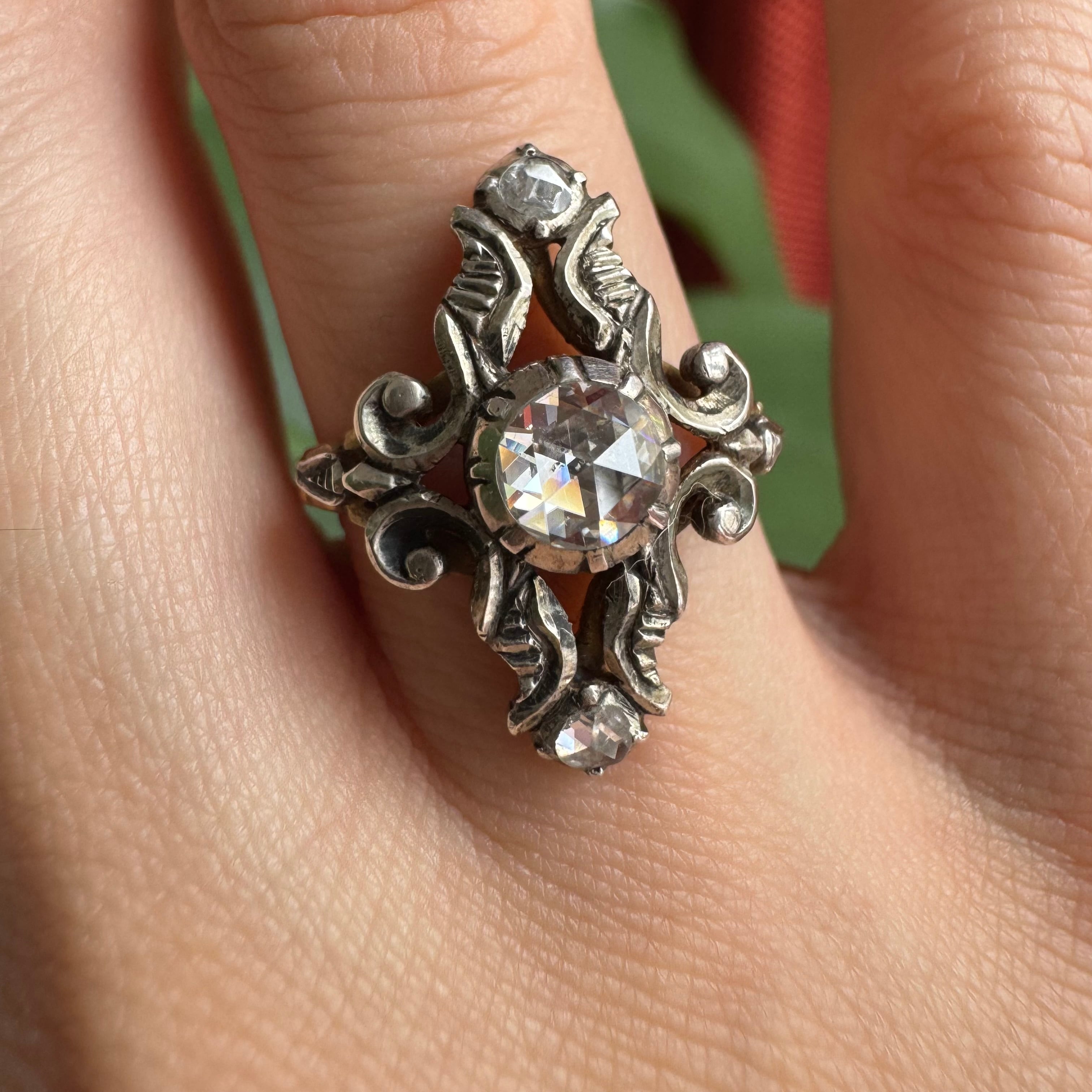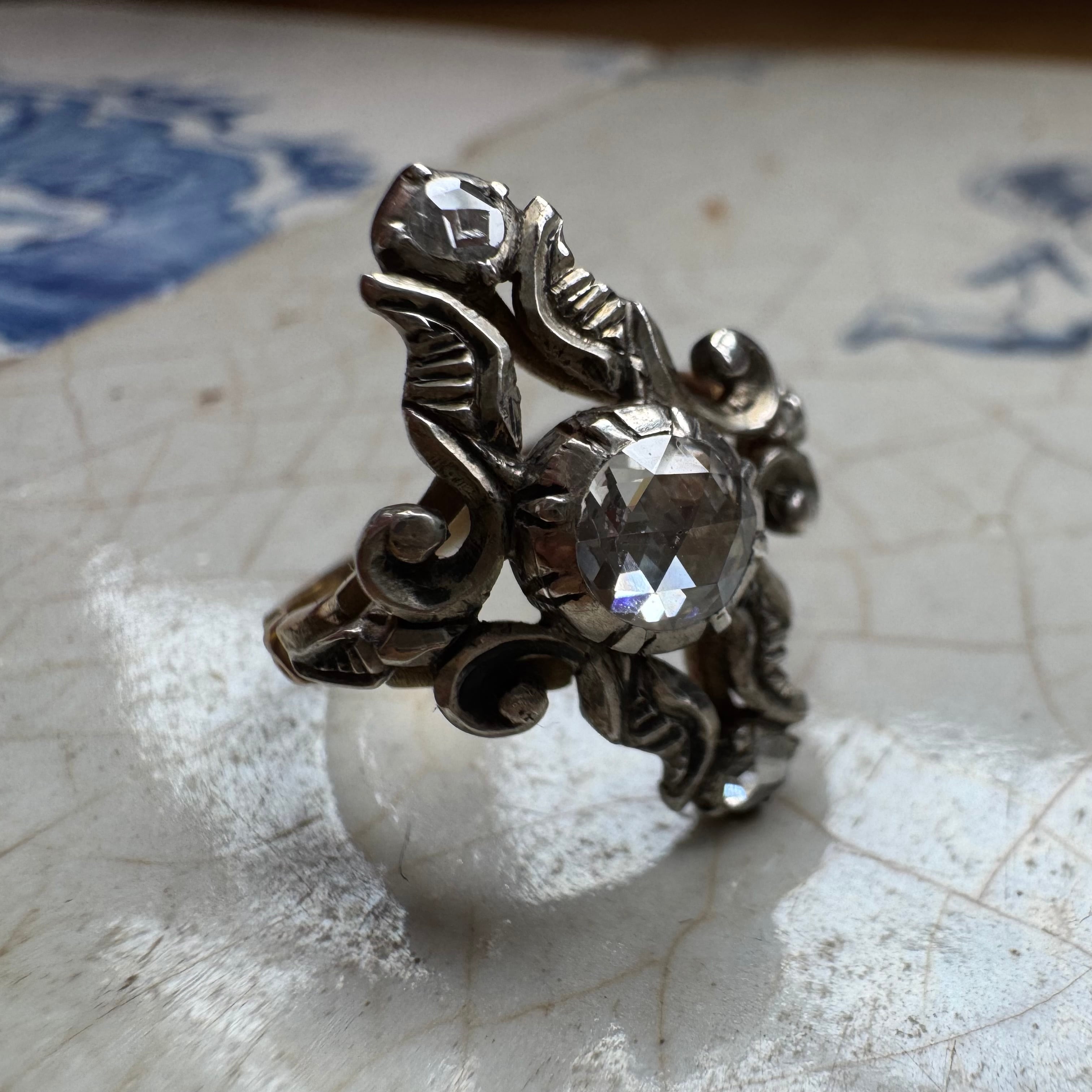 中心に大粒のダッチローズカットダイヤモンドがセットされた典型的なダッチリング。