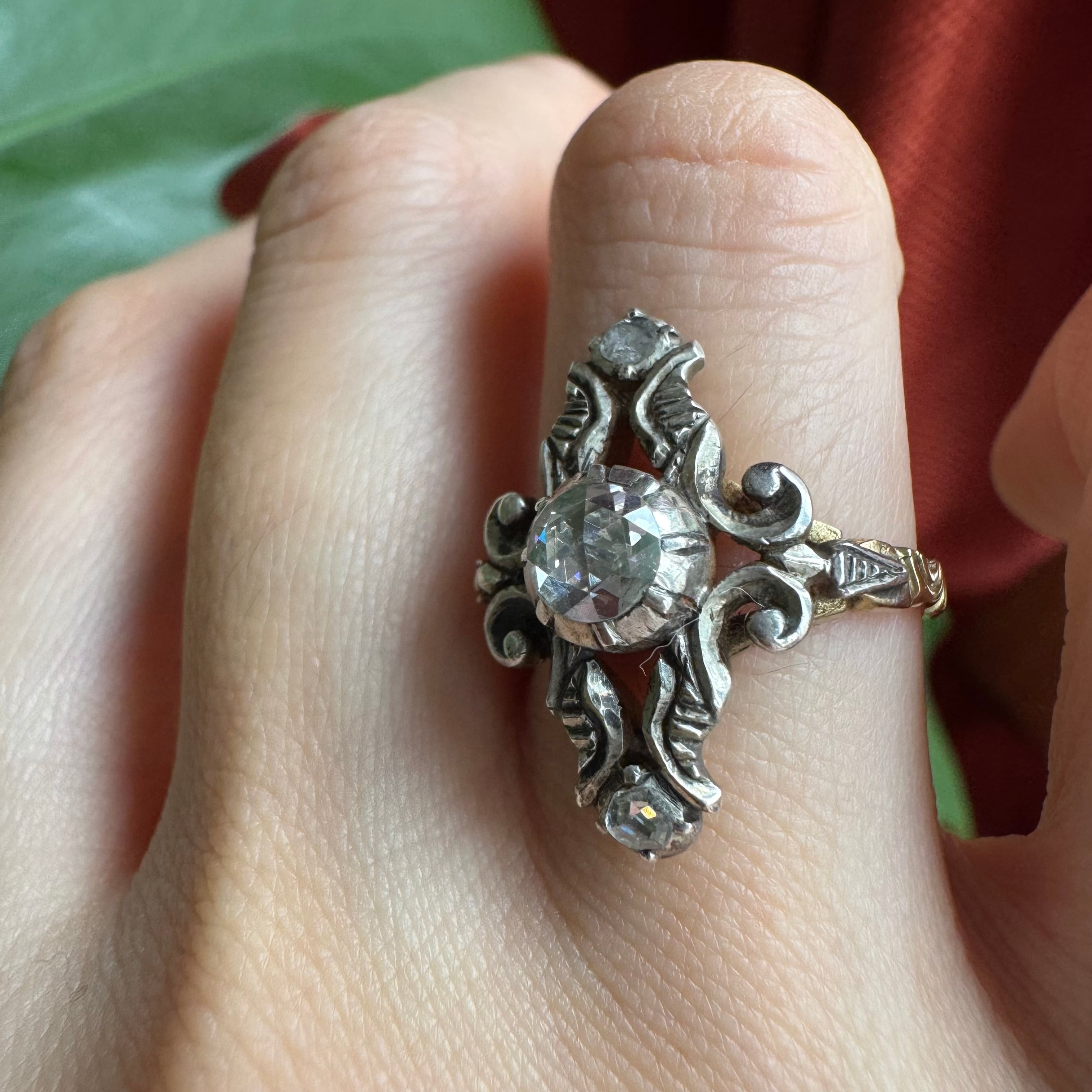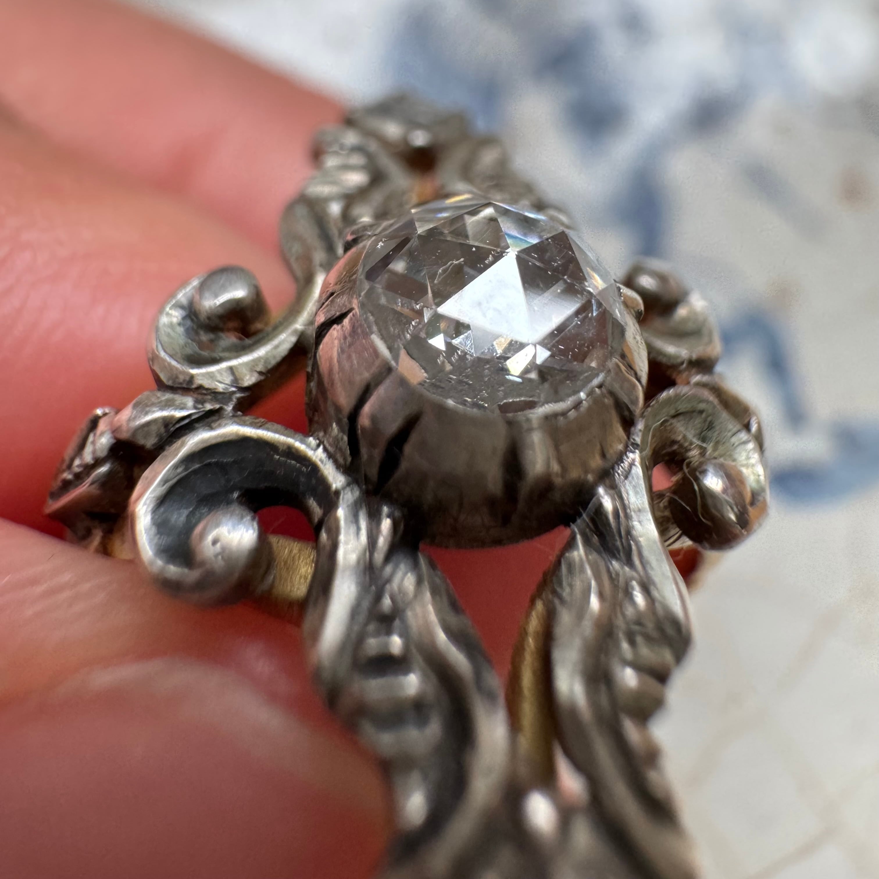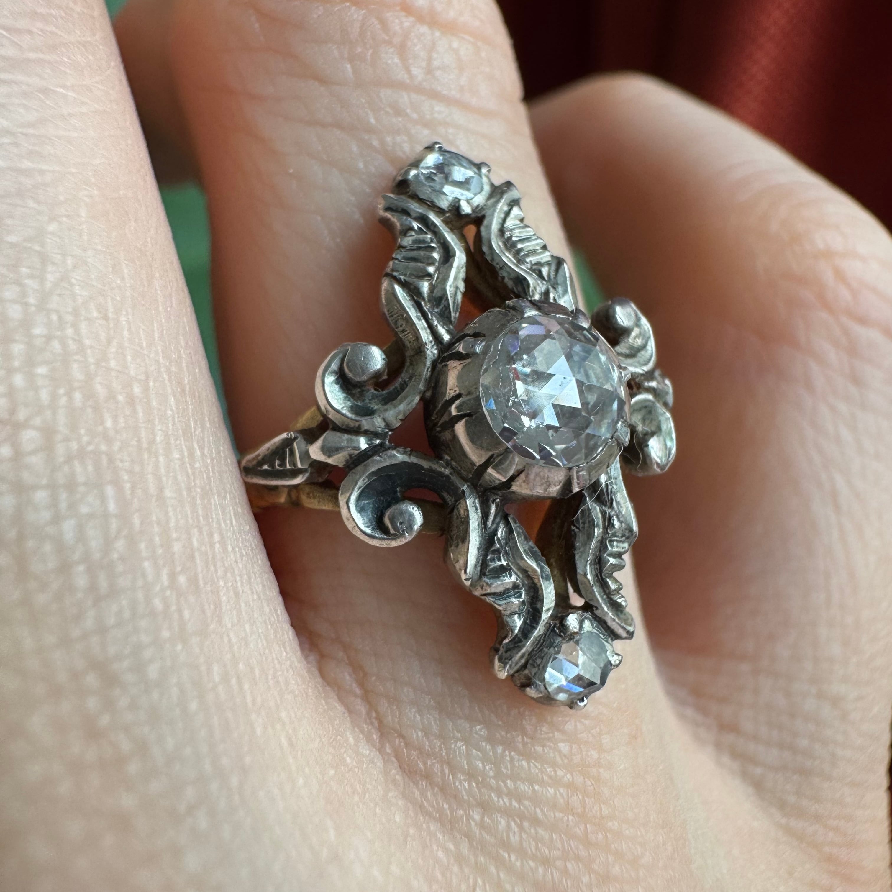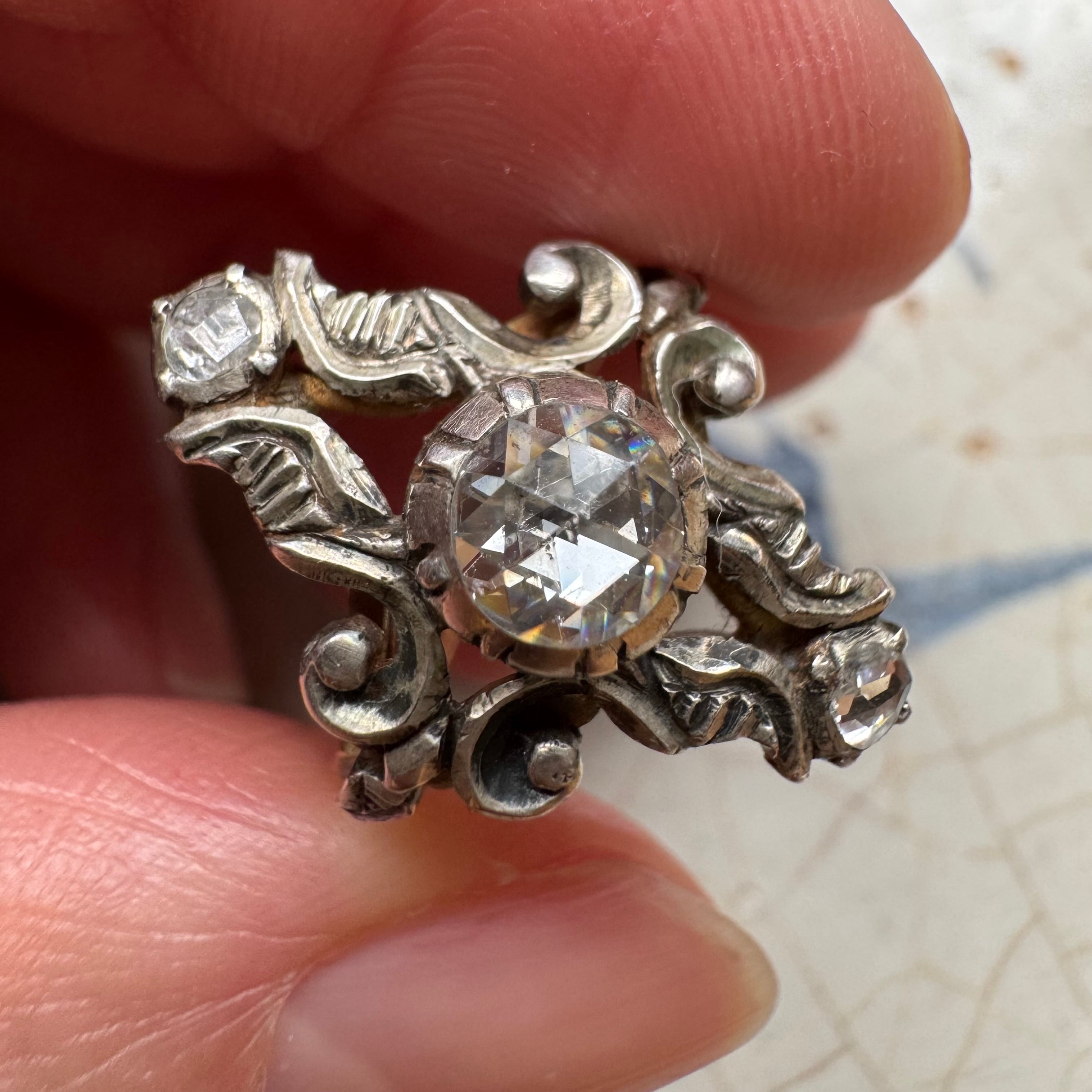中心に大粒のダッチローズカットダイヤモンドがセットされた典型的なダッチリング。
