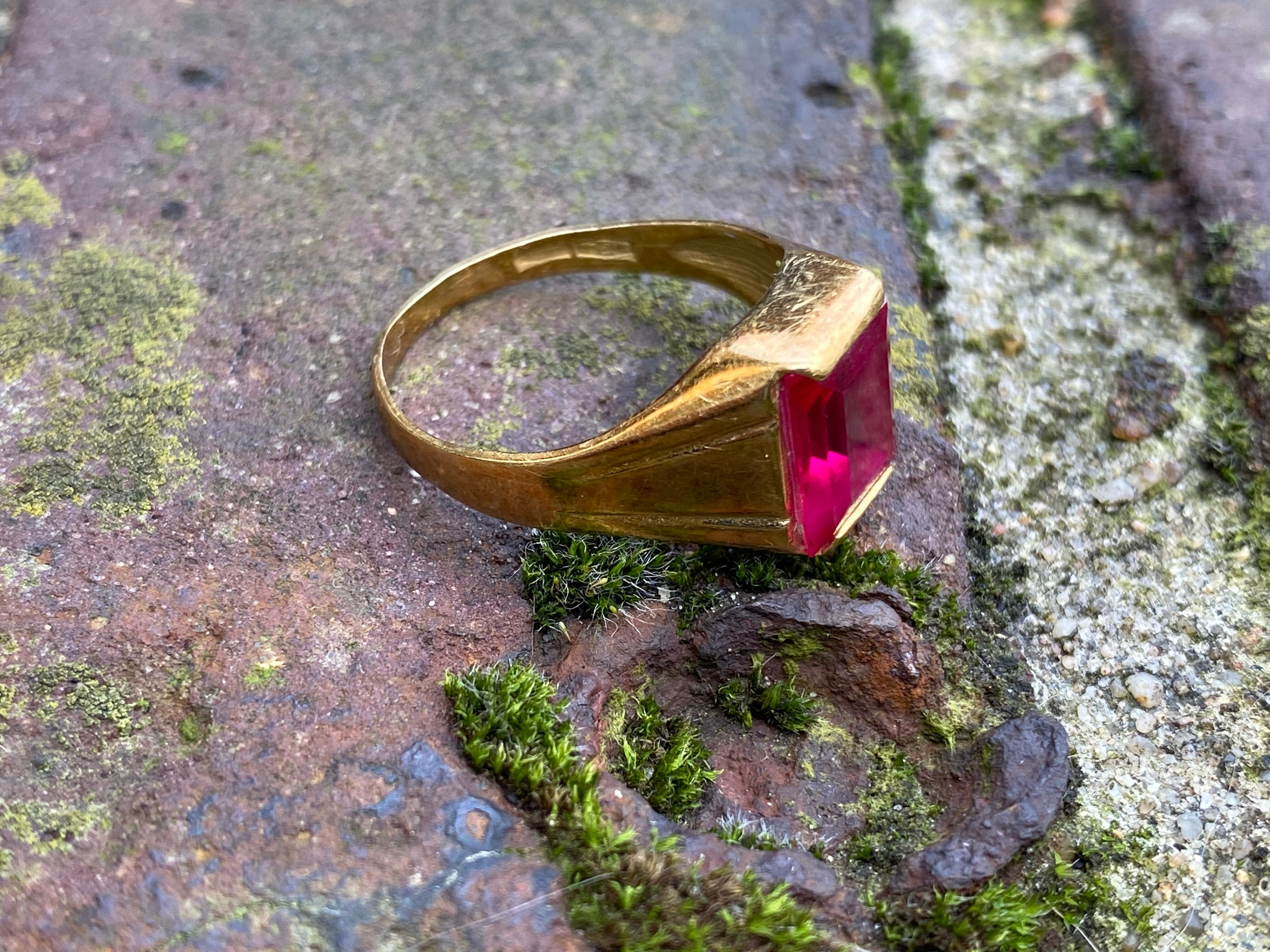 18gold とエメラルドカットされたSynthetic Rubyのリングです。