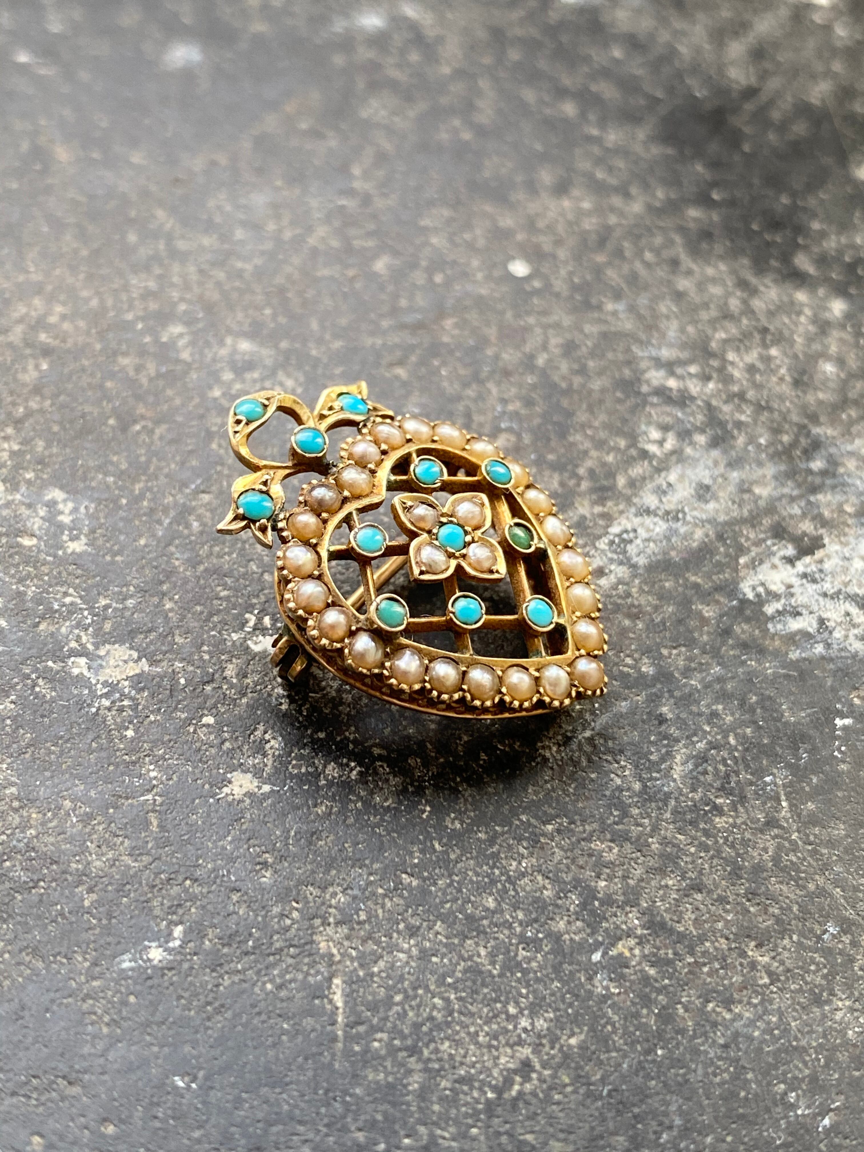【国内発送】ヴィクトリアン期 ターコイズ & パール ハート型 ブローチ