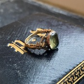 中心に大粒のペリドットのセットは現在とは異なり爪の部分も特徴的で石を優しく包んでいます。そこからアームにかけて植物を連想させるような彫金から当時の職人のこだわりを感じます。