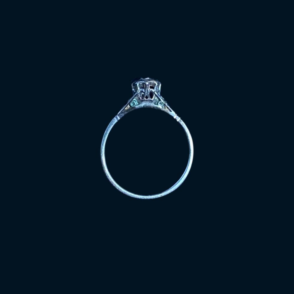 冠のようなプロングからショルダーにかけてアールデコ調の細かいミル打ちに3石ずつ両サイドにダイヤモンドがセットされ優美なデザインです。
