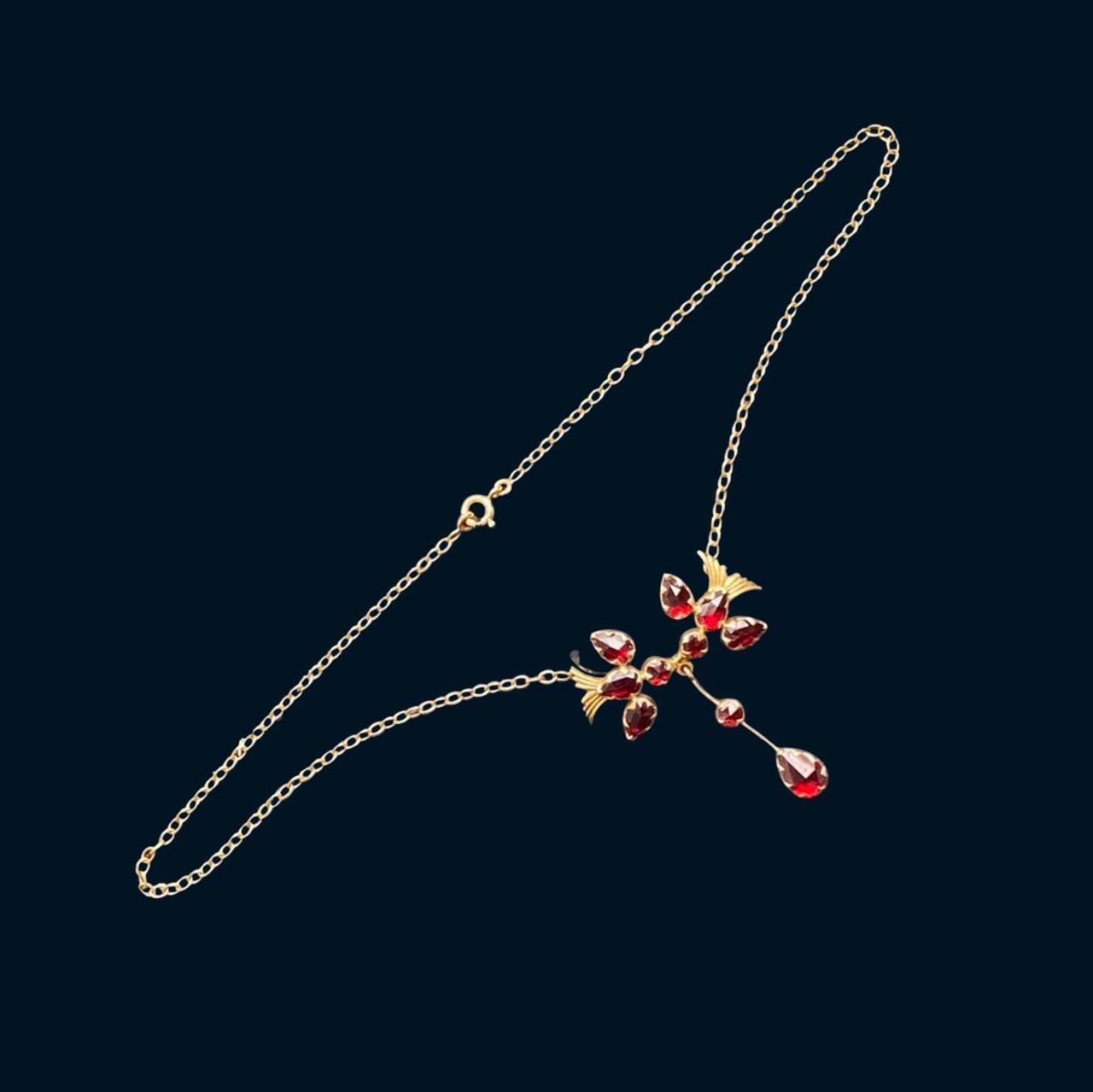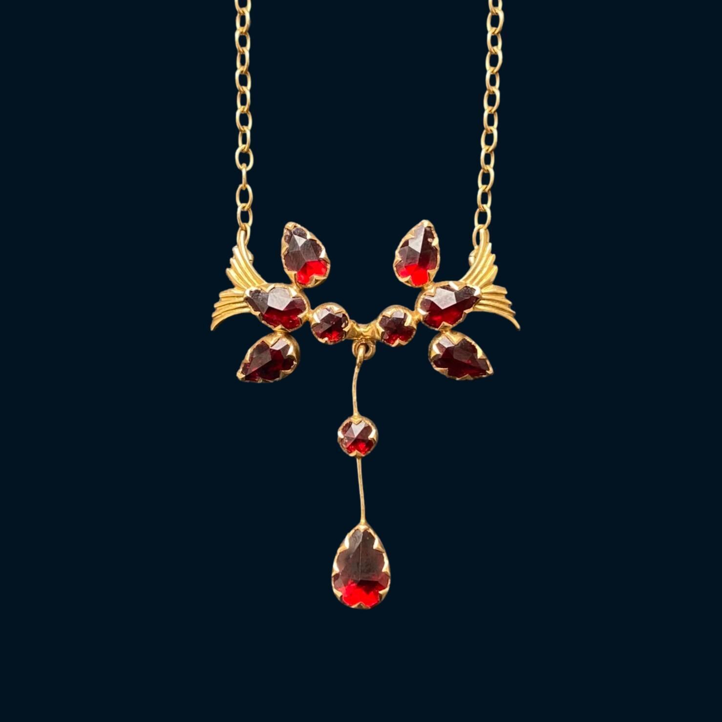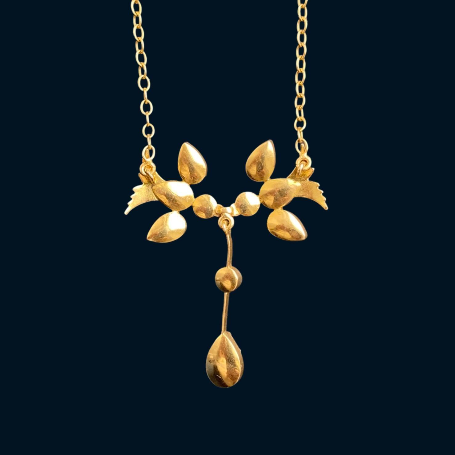 空から降りて来た二羽の鳥が向き合ったロマンティックなネックレスで中心に雫のように揺れる細工を施されています。手に取ってみるとデザインを眺めるも良し着用すると優美で華のような蝶やリボンのような主人の想像で愉しめる一品です。