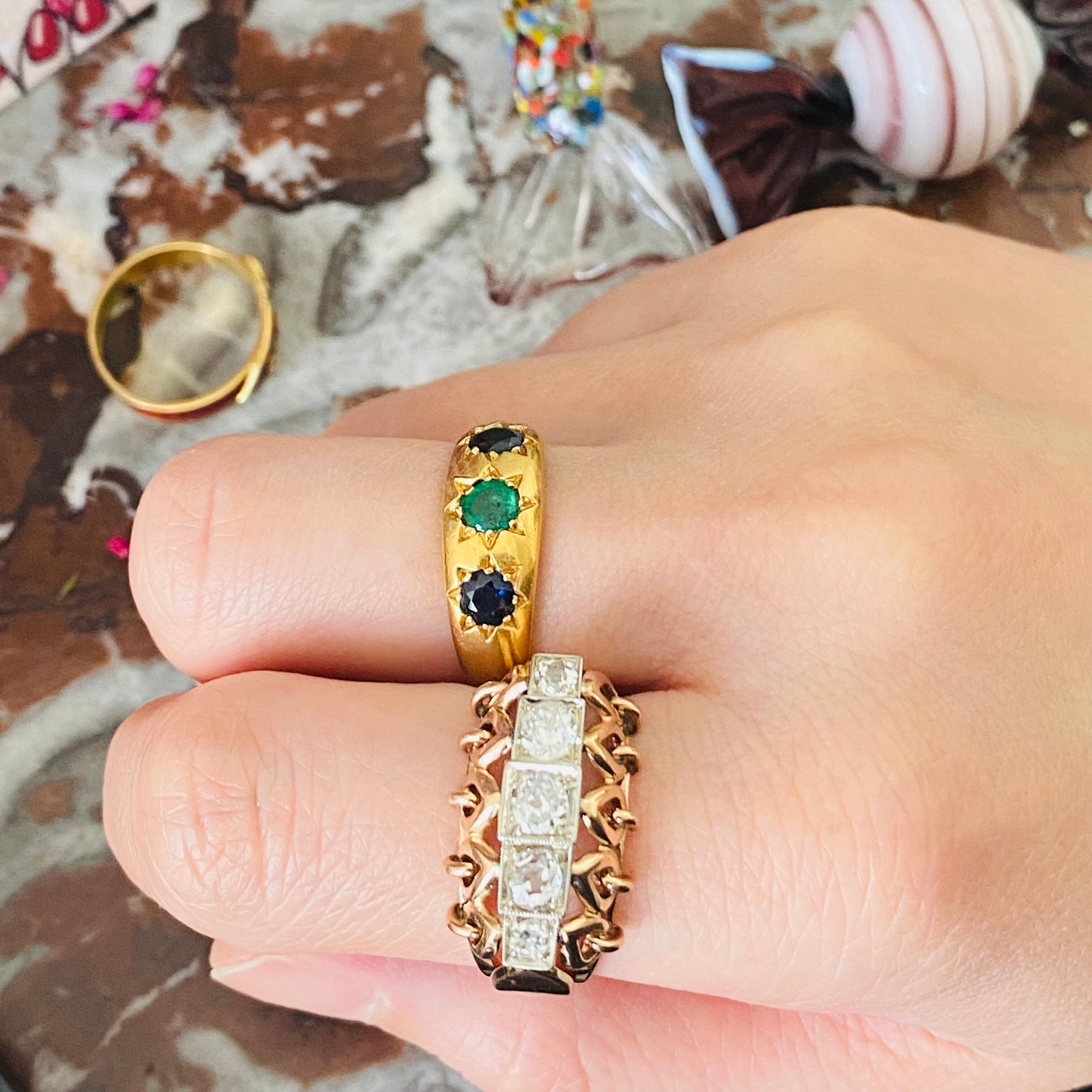 手編みのニットのような編み込みの彫金に包まれた5石のオールドヨーロピアンカットダイヤモンドがセットされています。