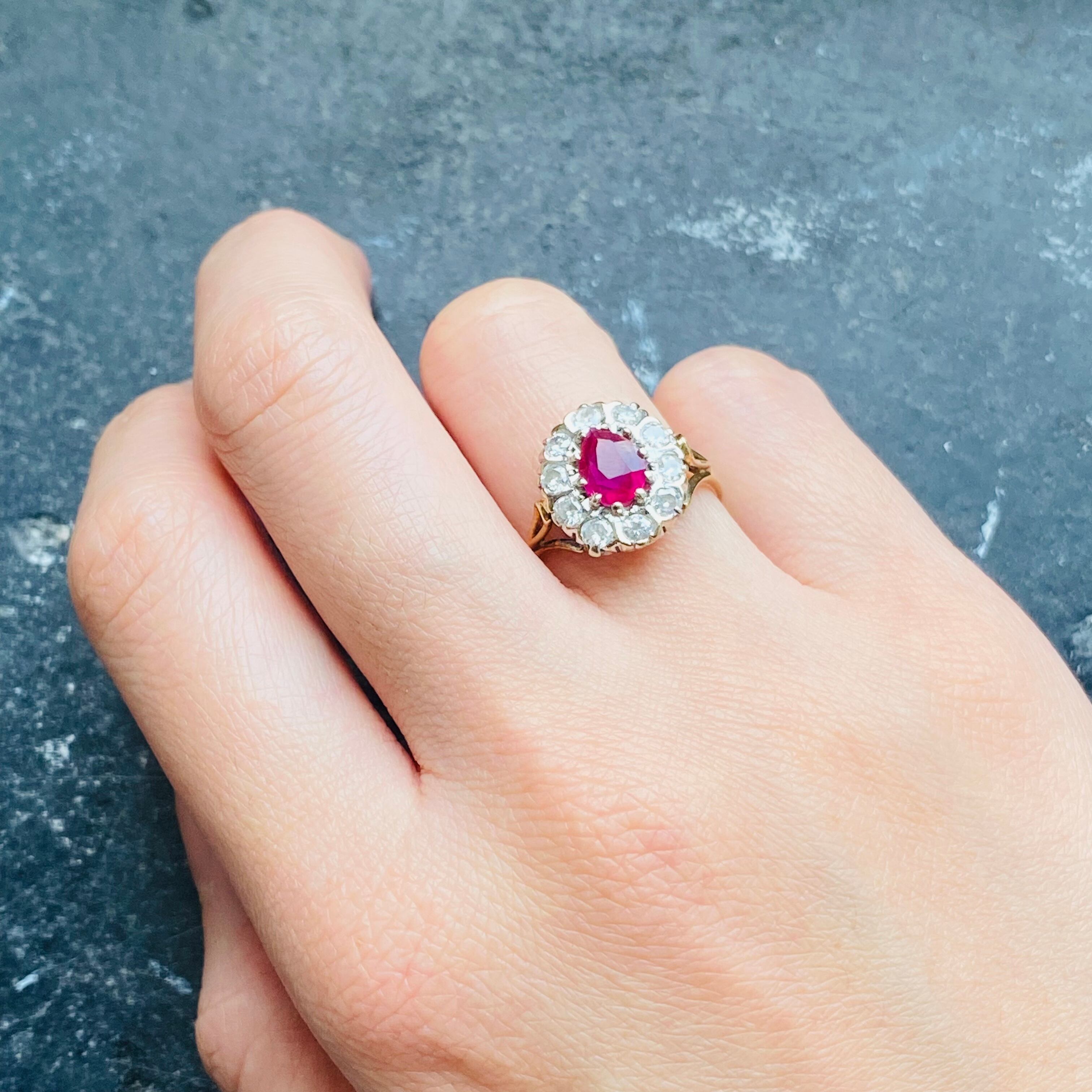中心のルビーは若干雫のような形でそれを囲む大粒のダイヤモンドは一枚一枚丁寧に花弁を連想させるような彫金でセットされています。