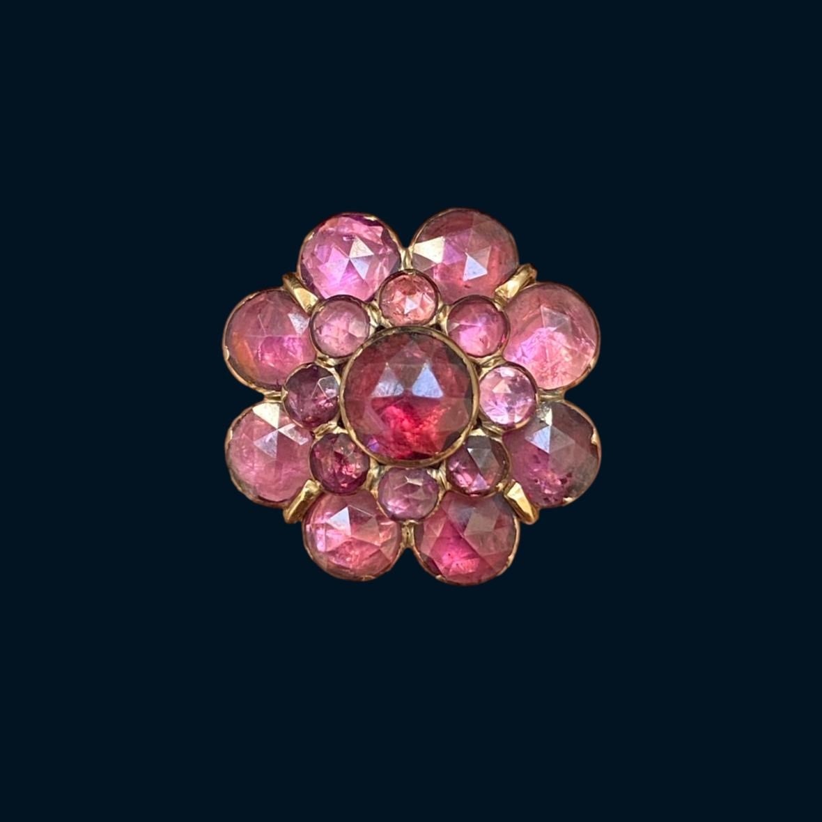 大粒の石が9石と中心のに8石贅沢に使用されています。大きなお花にも見えますが四葉のクローバーにも見え身につけてもよしアンティークとして鑑賞にも楽しめるサイズ感です。