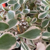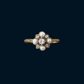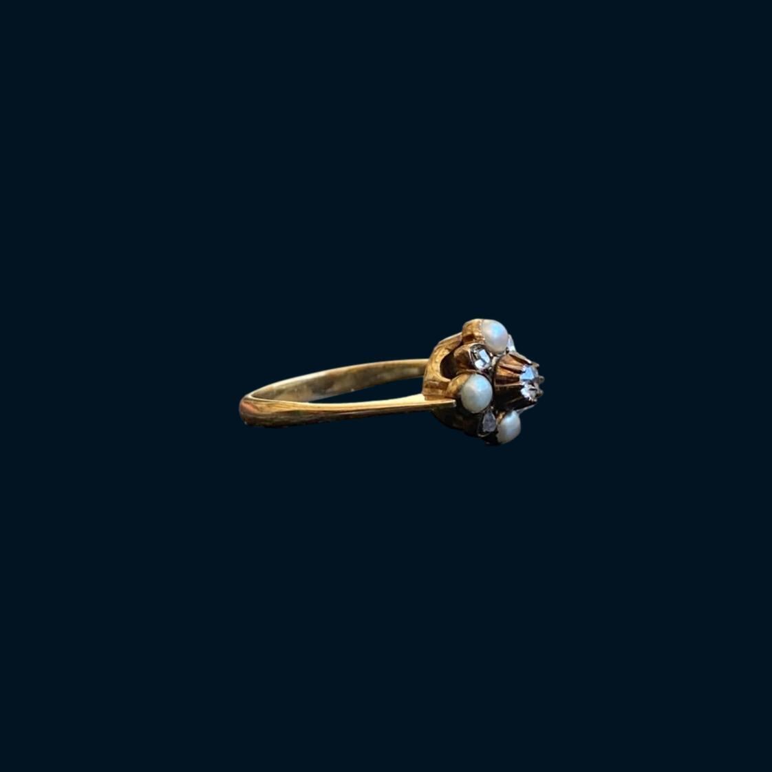 中心はオールドヨーロピアンカット、四方にはローズカットダイヤモンドがセットされその間にはパッとパールが顔を出すクラスターリングです。