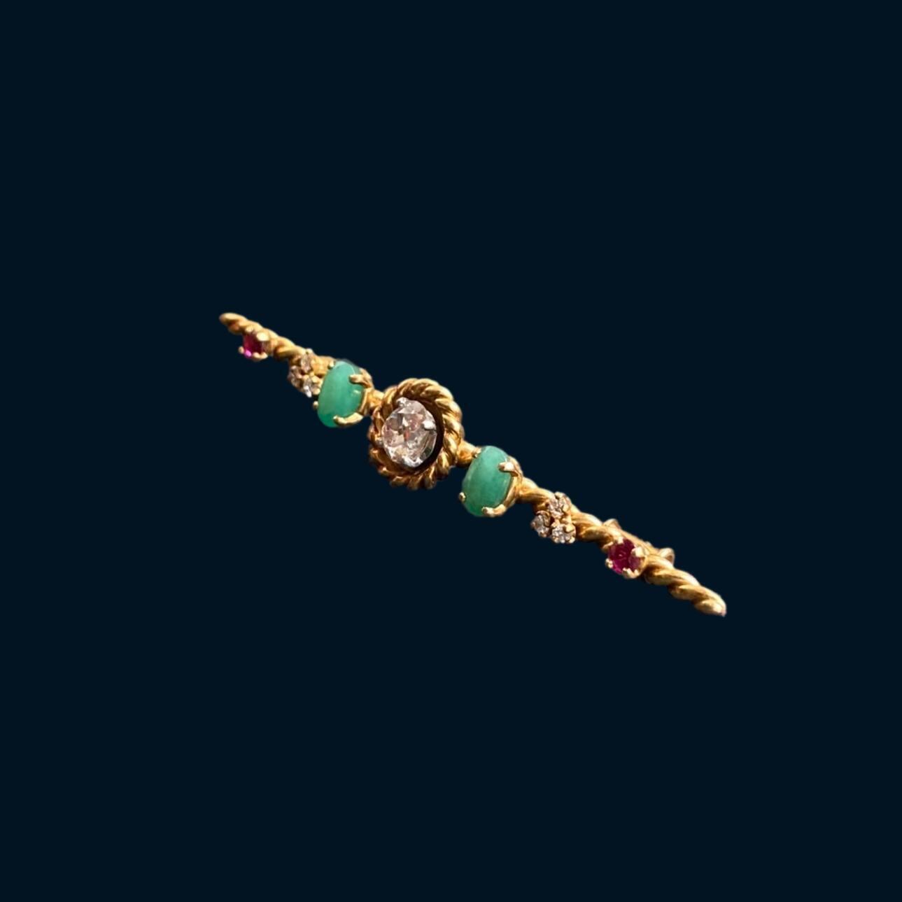 クッションカット ダイヤモンド、エメラルド & ルビー バーブローチ