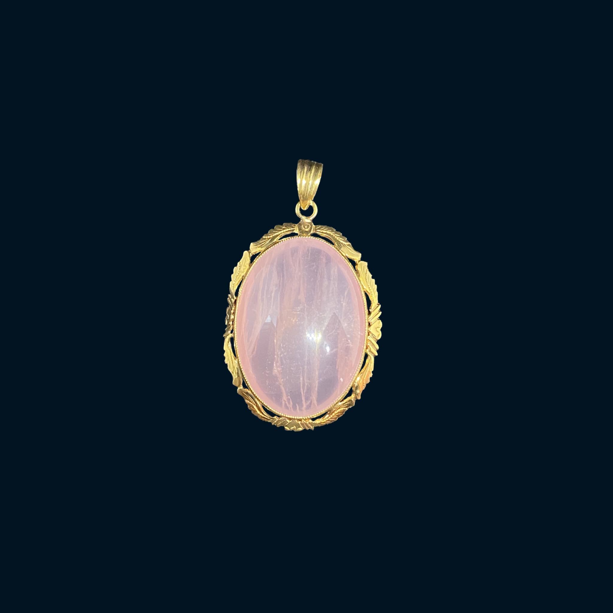 丁寧で繊細な彫金に囲まれたローズクォーツで彫金に目を向けますとハートを型取り左右に翼が広がっているようなデザインです。カボションカットにより石の内面も見られさらに淡いピンクの魅力を最大限に引き出してくれます。