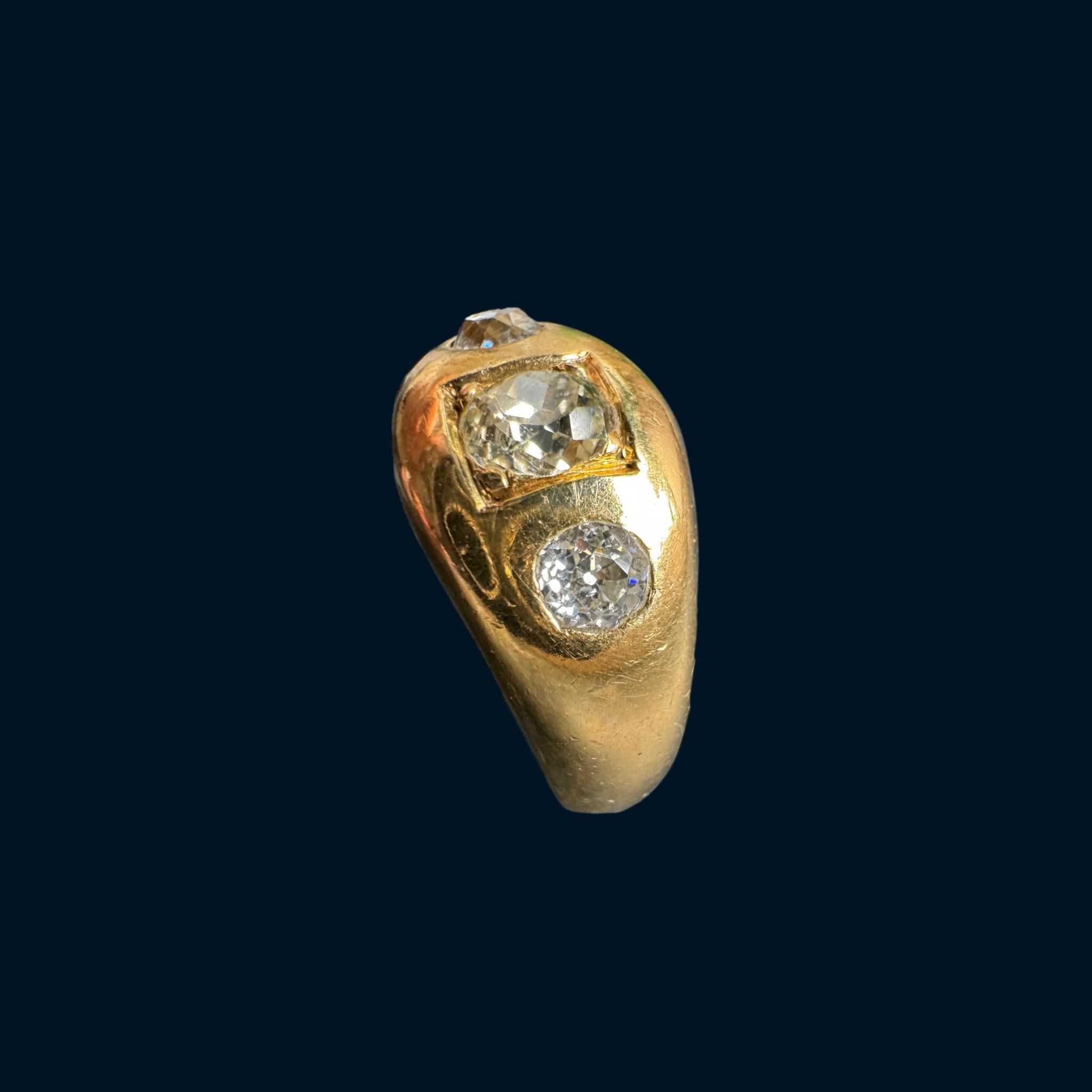 ぷっくりとした重量感のある金に、見応えのあるダイヤモンドは中心にオールドマインカット、両端にはオールドヨーロピアンカットセットされています。