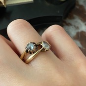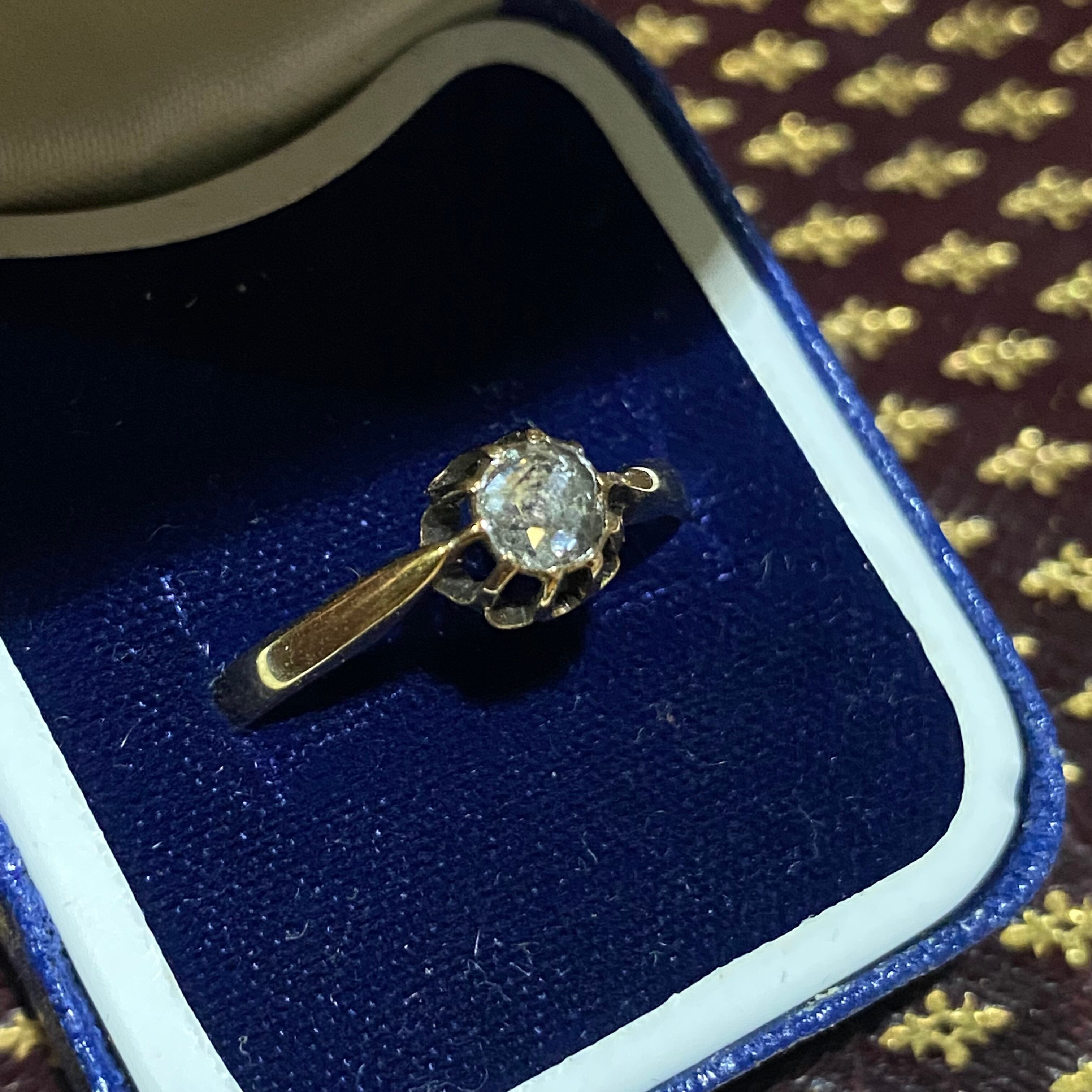 こちらもうるうるっと魅了される輝きのダッチローズカットダイヤモンドのソリテールリングで刻印には1852-1953年に使用されたoak leaf(オークリーフ)で14金を示し、希少な一品です。