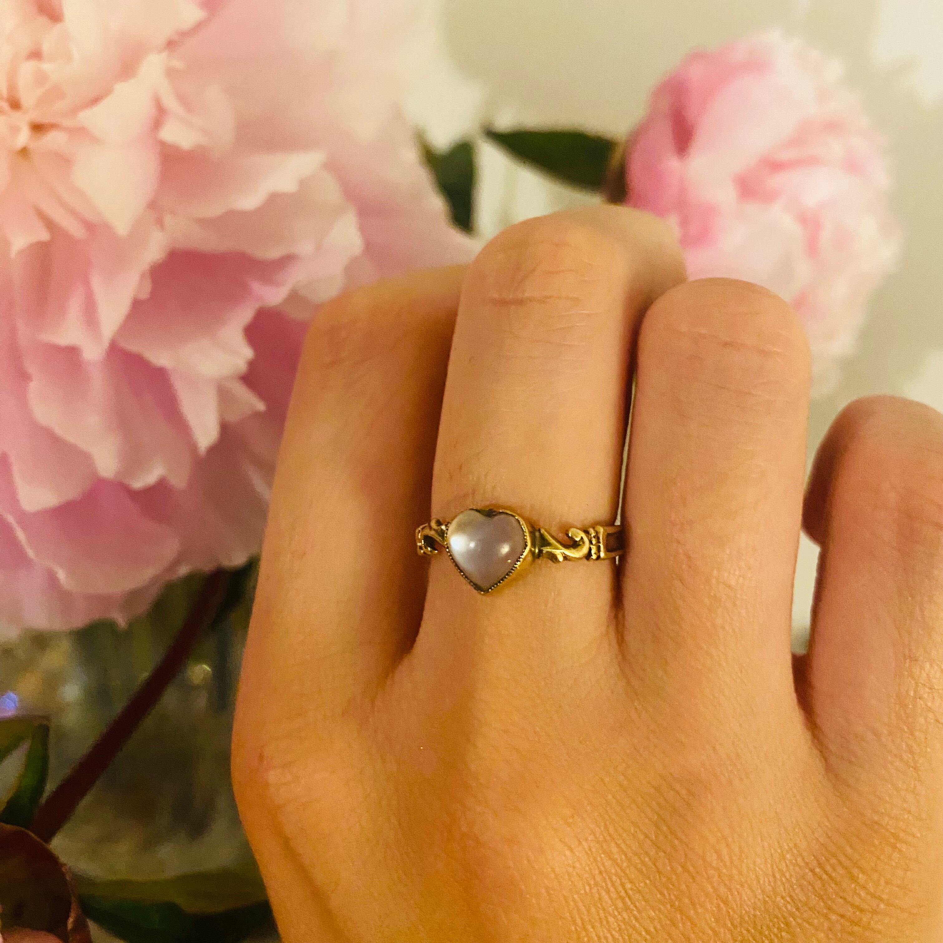 神秘的な宝石の一つ、ムーンストーンをハート型に施されとても細かいミル打ちで丁寧にセットされたとても希少なリングのご紹介です。少し薄暗い中での輝きに魅了されます。