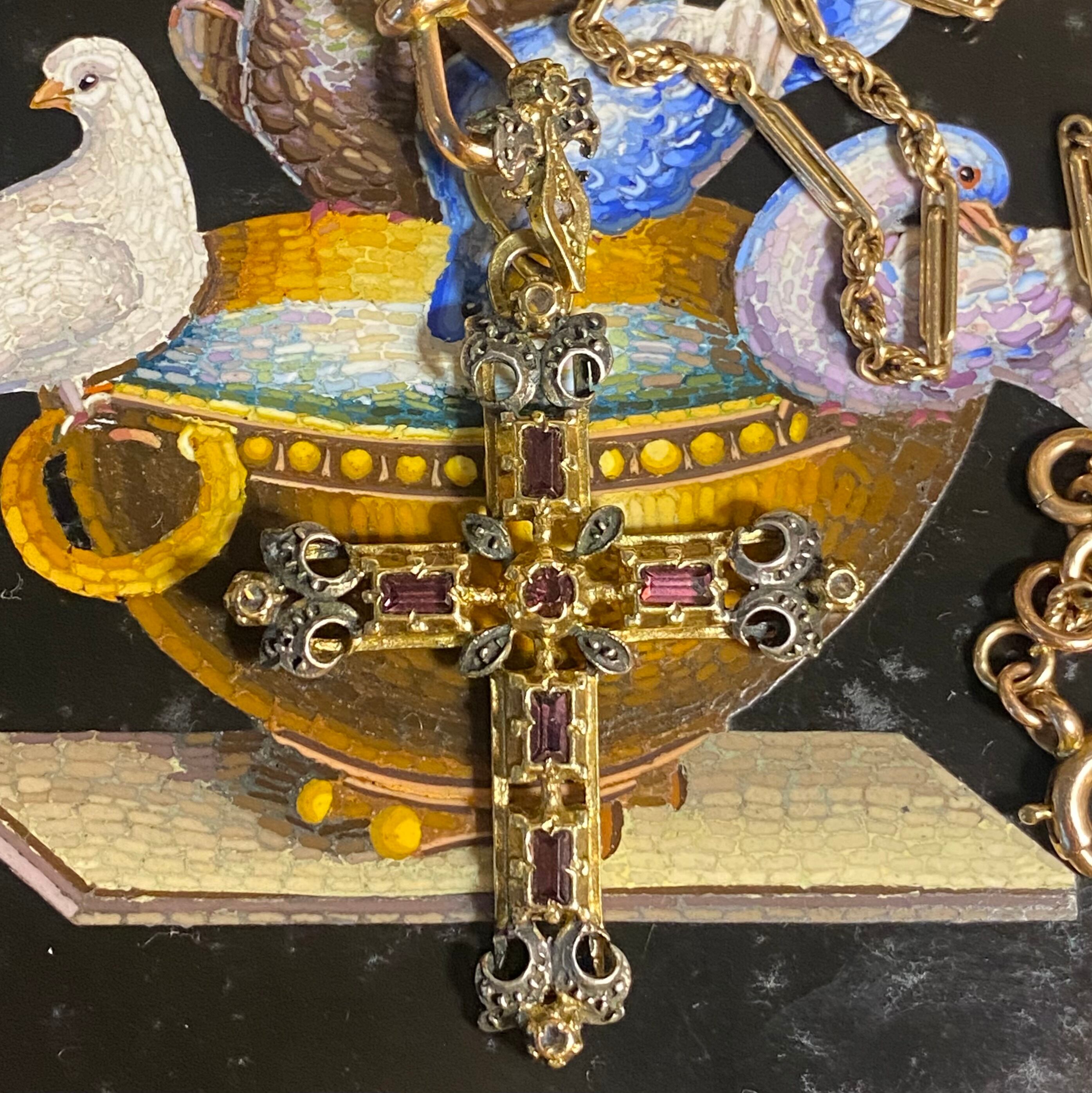 四方にセットされている石はローズカット、クロス上の石はエメラルドカットが施されているようです。石座の一つ一つの装飾もこだわりを感じられ丁寧に彫金が施されています。