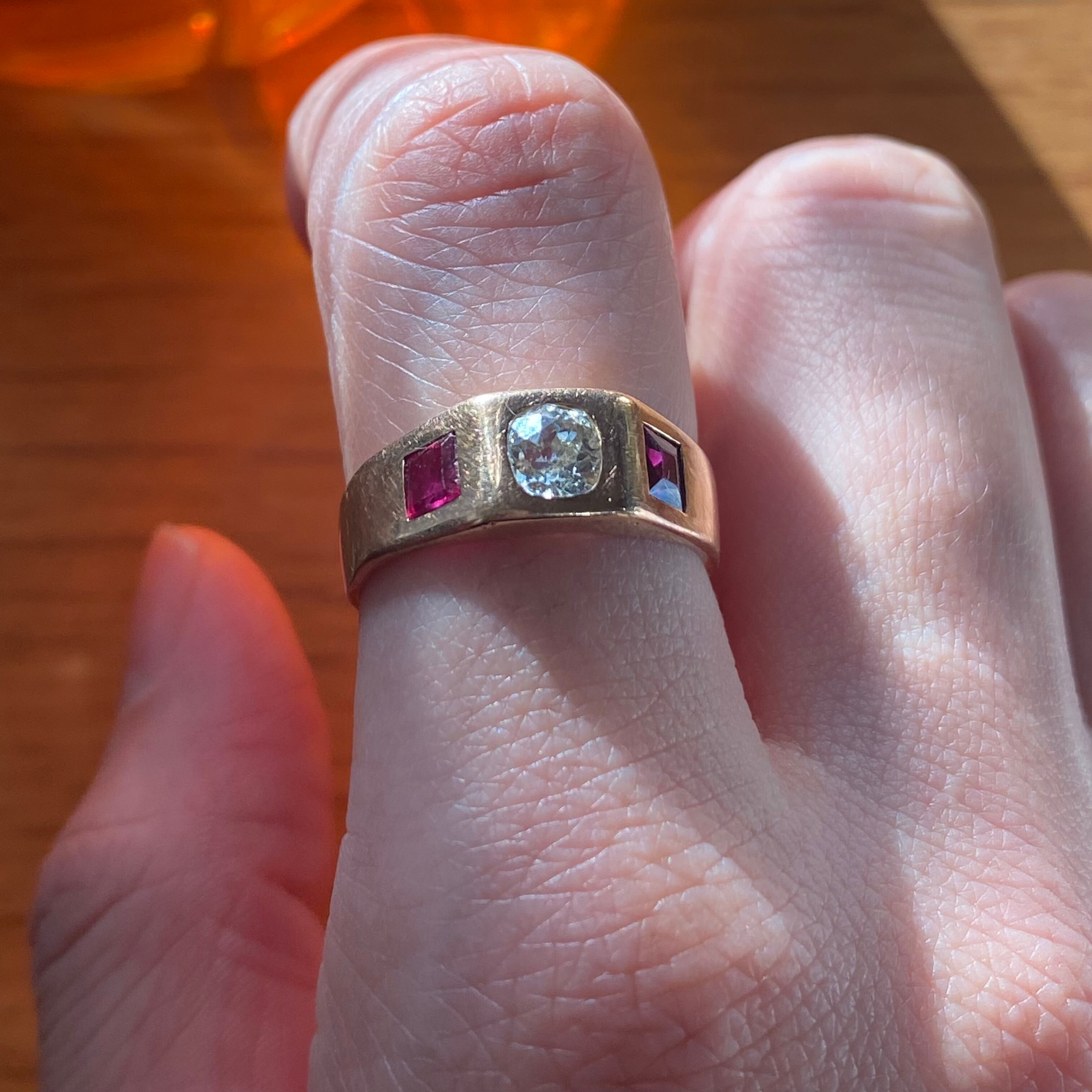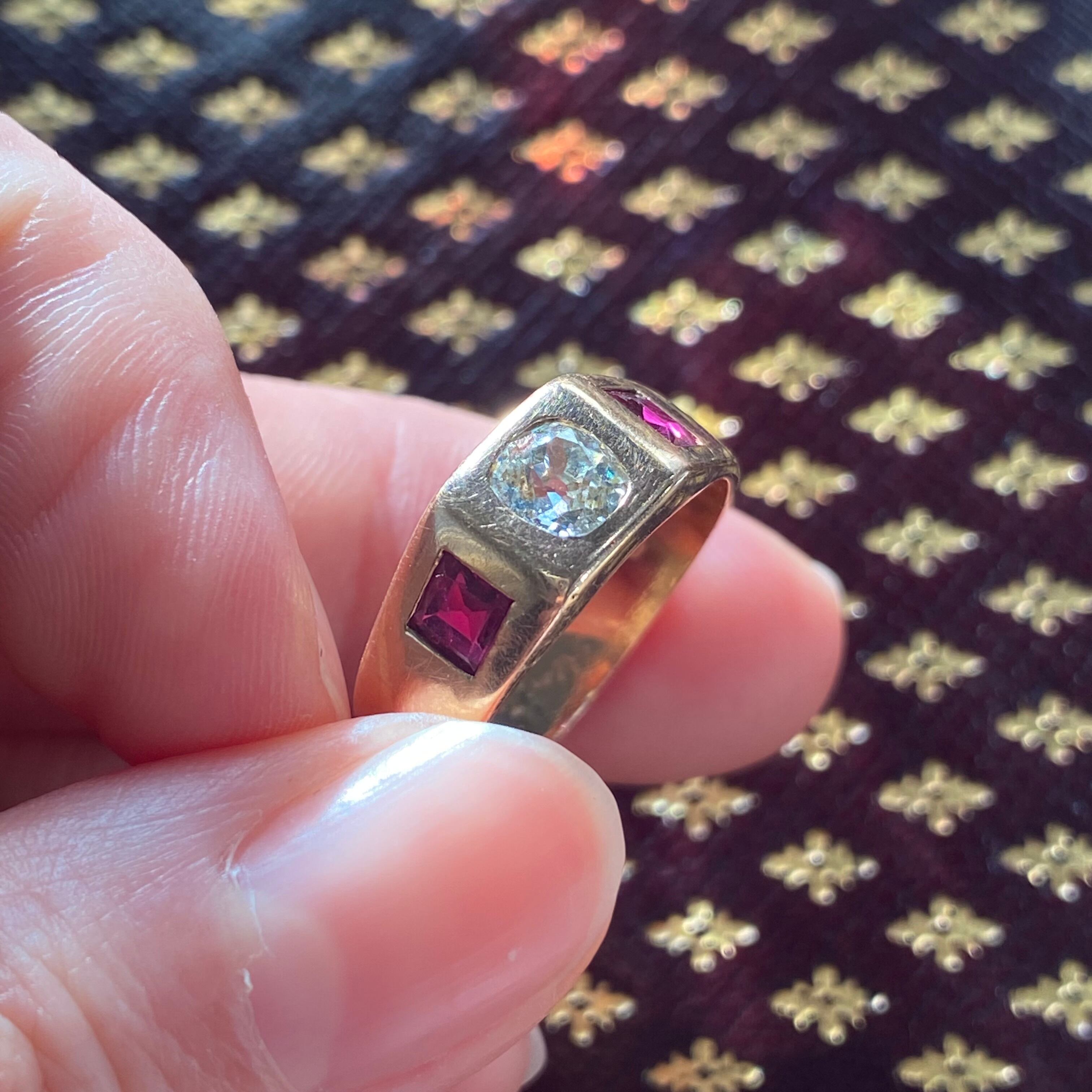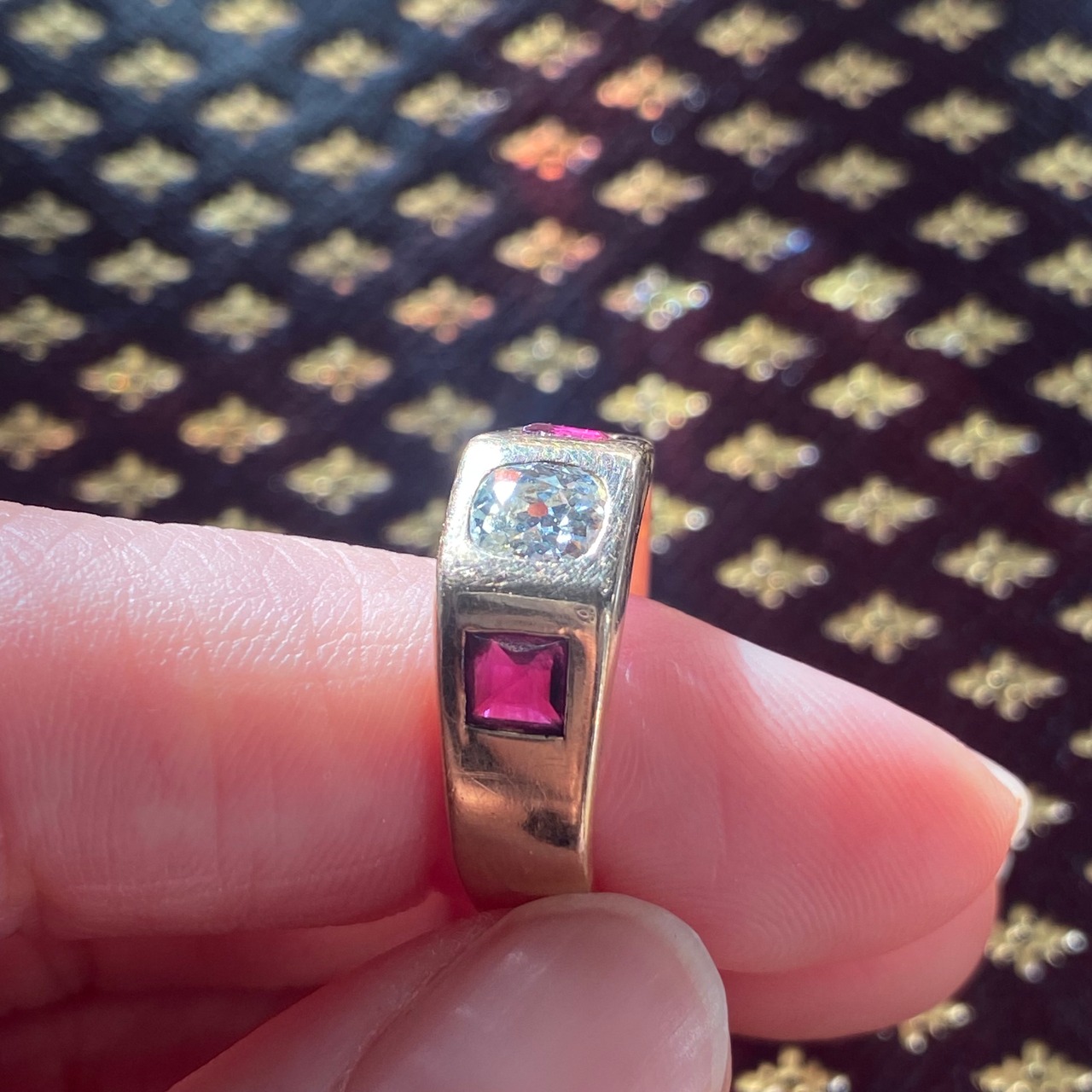 片方のルビーに若干あそびがありますがデザインの形状から着用時に外れるような心配はありません。古い品ですので、スレや小傷、時代変化あり。写真からご確認ください。