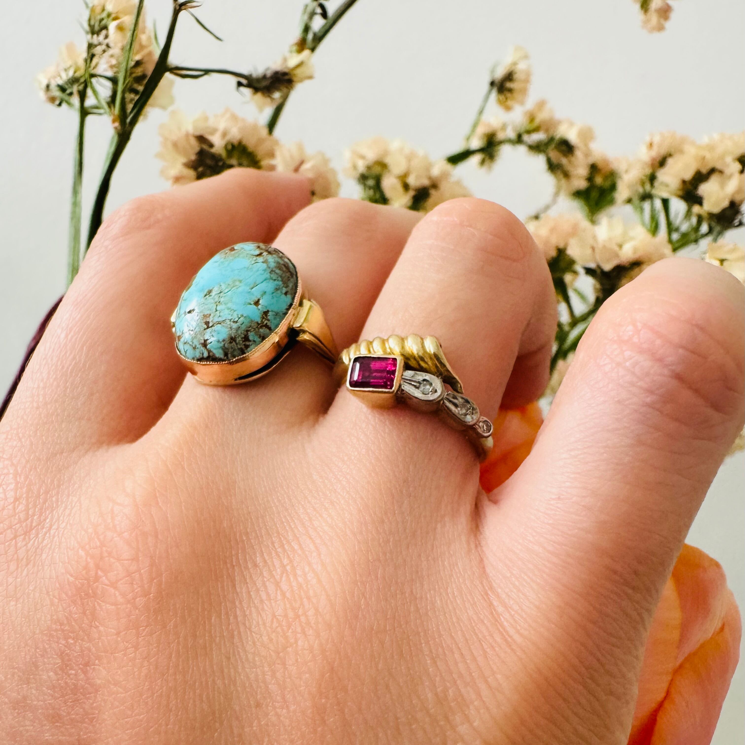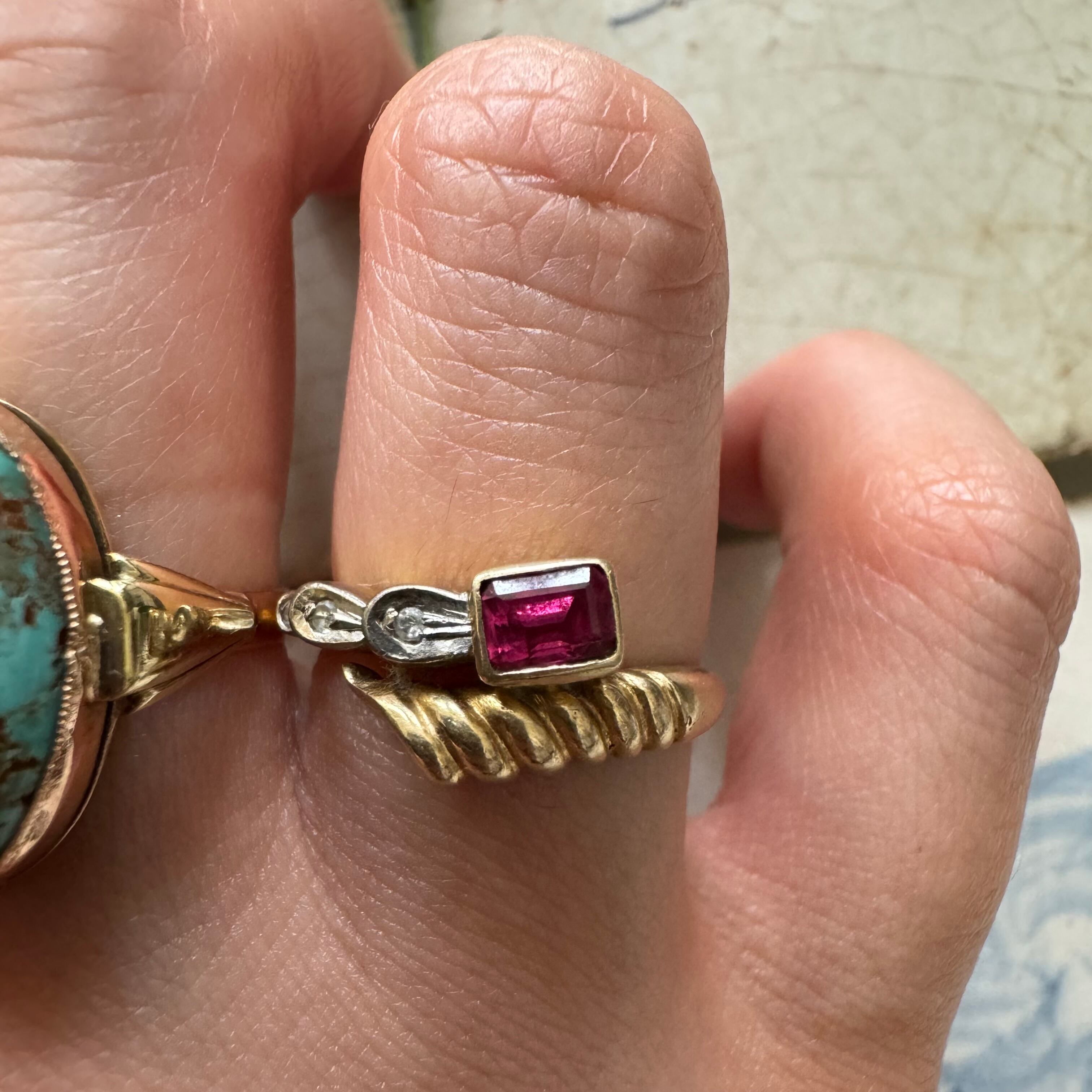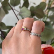 ルビーを支えるアームには羽のようなシルバーが施され着用時にはどこをとっても趣のある一品です。