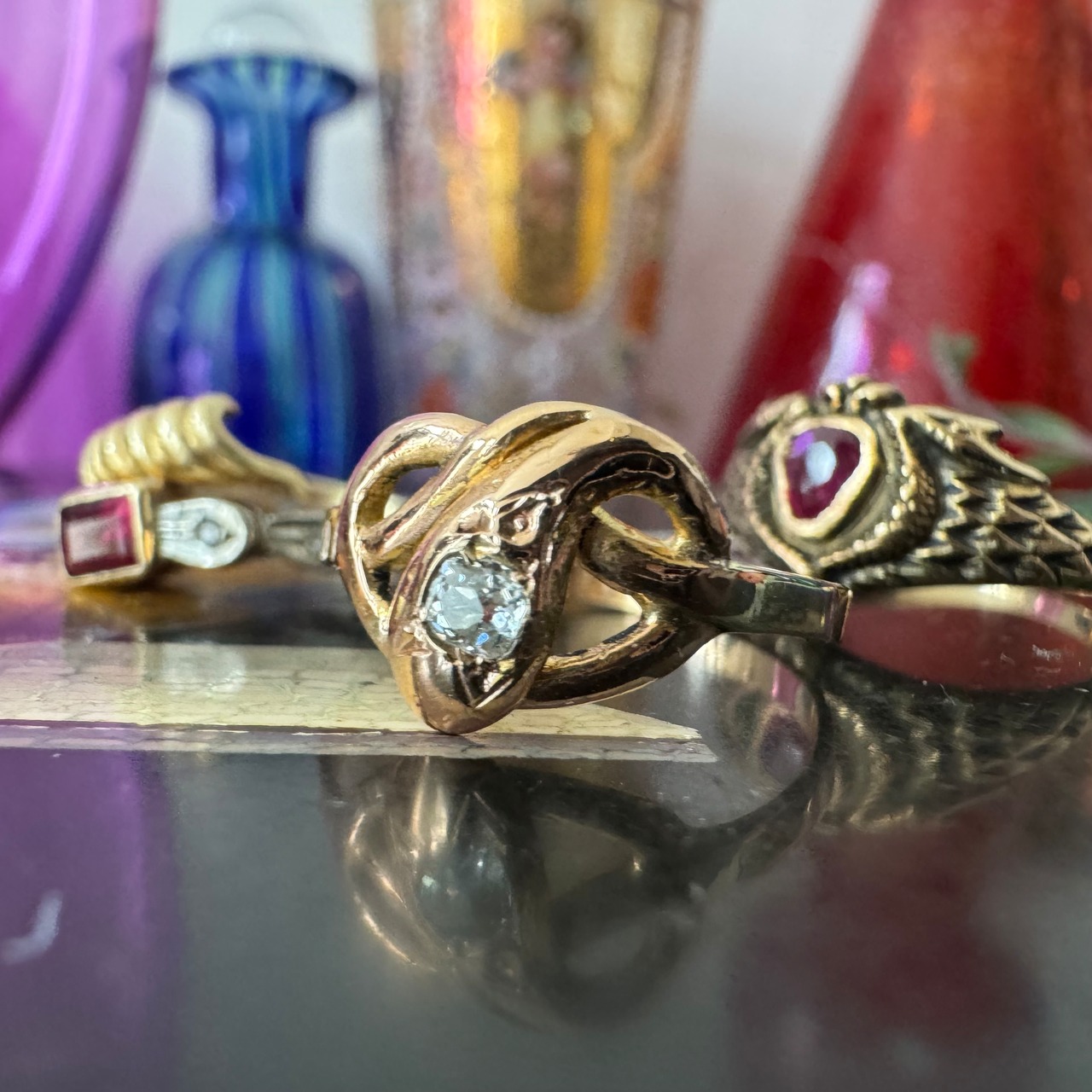 アンティークジュエリーには蛇や蜘蛛をモチーフにしたジュエリーが多く存在し初めて目見した際には私は身に付けないかなぁ…と思っていましたがそのモチーフが示す意味や歴史背景を知ることで愛着が湧いたりすることが増えました。スネークリングもそのうちの一つで一度は手に入れたいと思えるリングです。