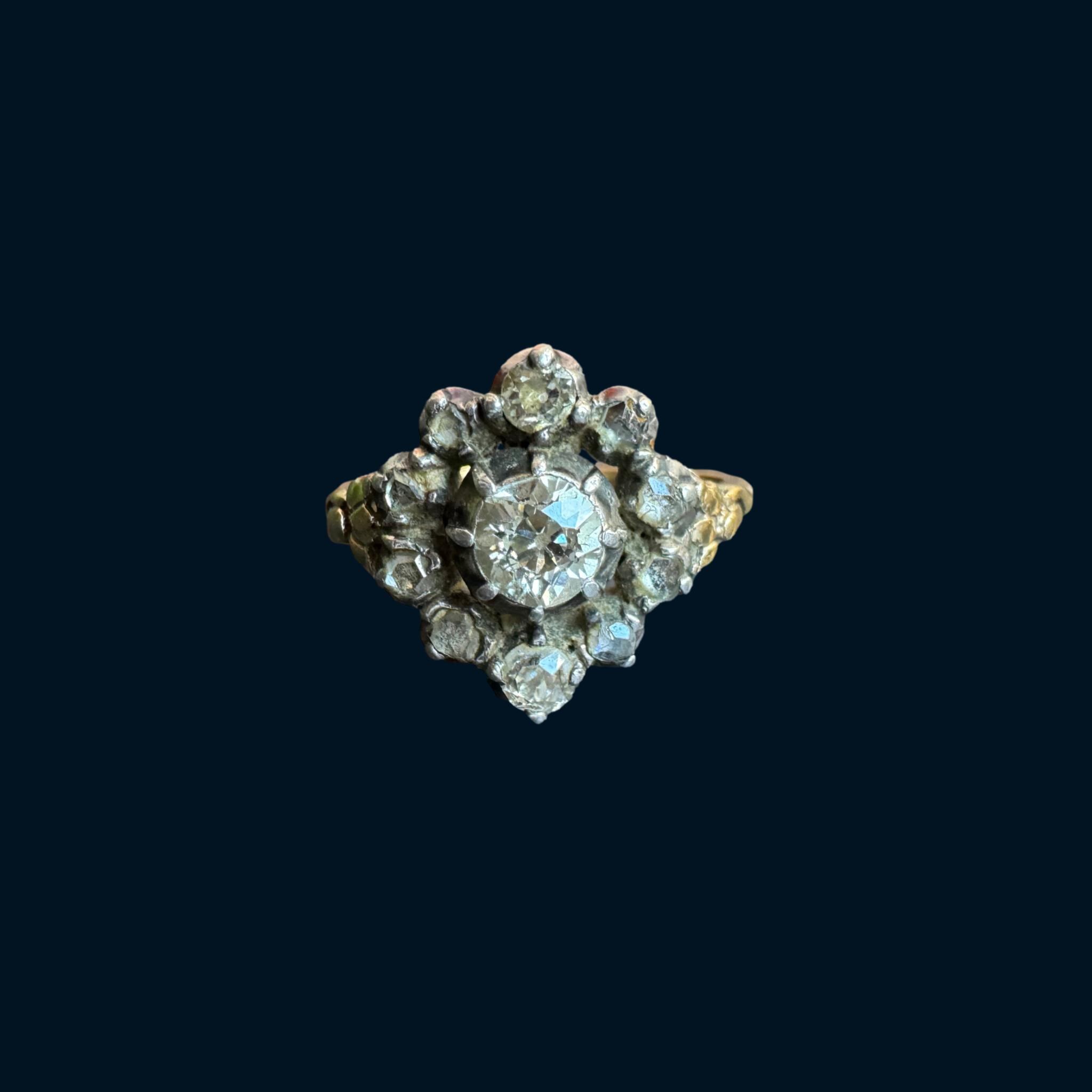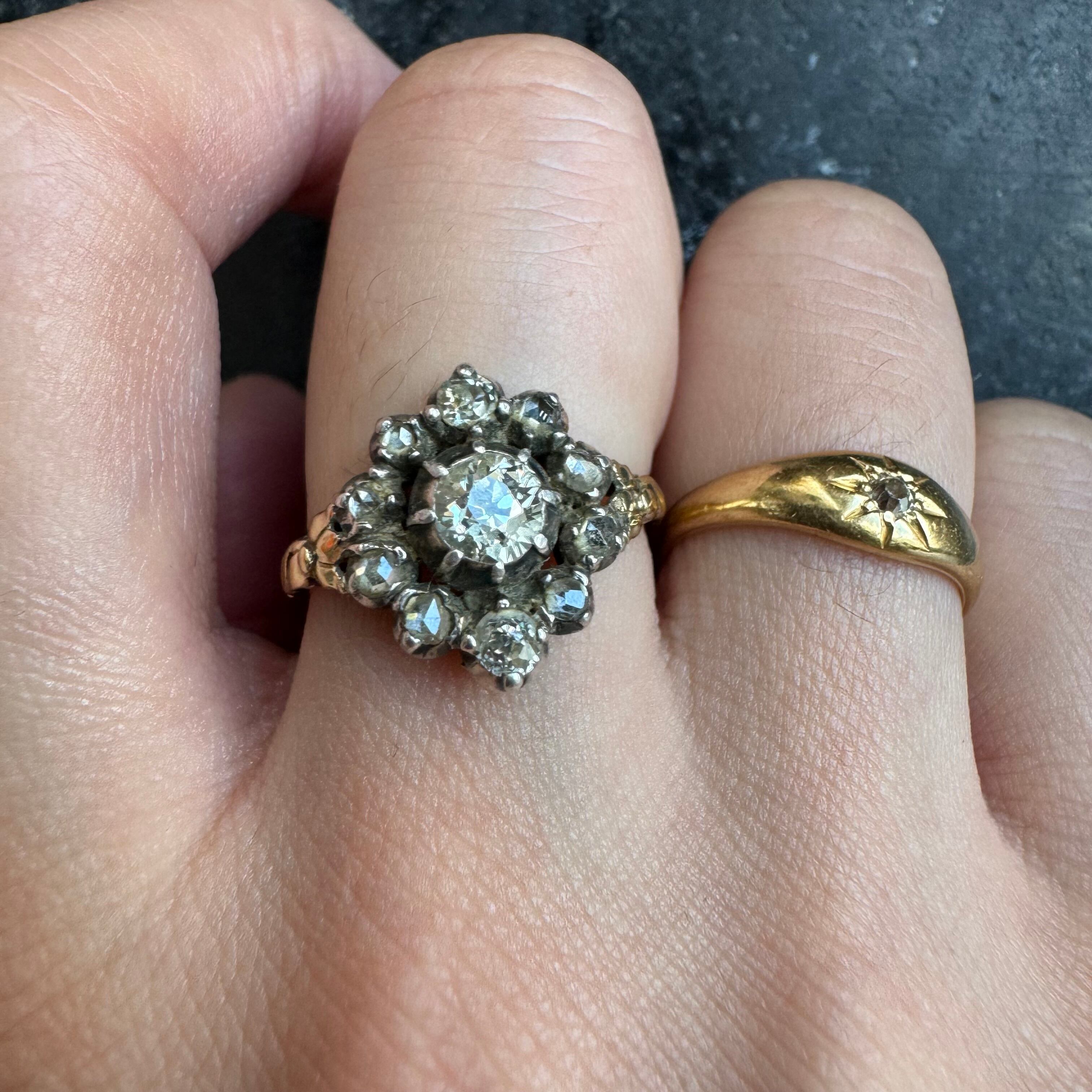 見応えのある大粒のオールドヨーロピアンカットダイヤモンドのクラスターリングのご紹介です。ローズカットダイヤモンド10石で中心の石を囲んでいてアームには植物の彫金が施されています。ダッチリングによく似たスタイルですが異なり興味深い一品です。
