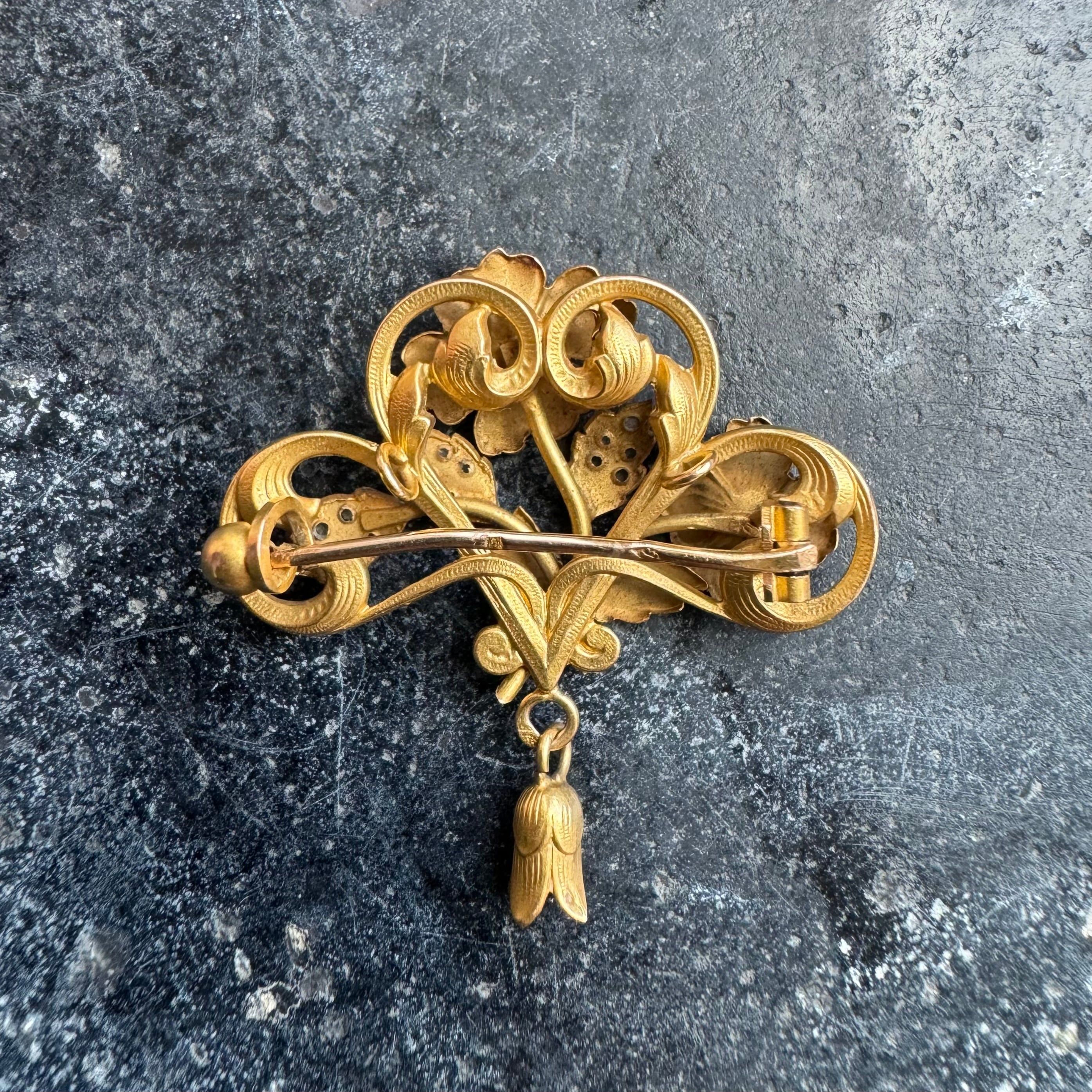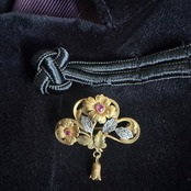 今作はダイヤモンドとルビーをセットされ当時類似のブローチの中でもワンランク上の仕上がりがわかります。また下部にはベルのような鈴蘭の彫金が揺れる細工となっていて上品で可憐な印象も与えてくれます。背面に2箇所通し穴がありますのでアレンジが必要ですがネックレスとしても使用可能です。
