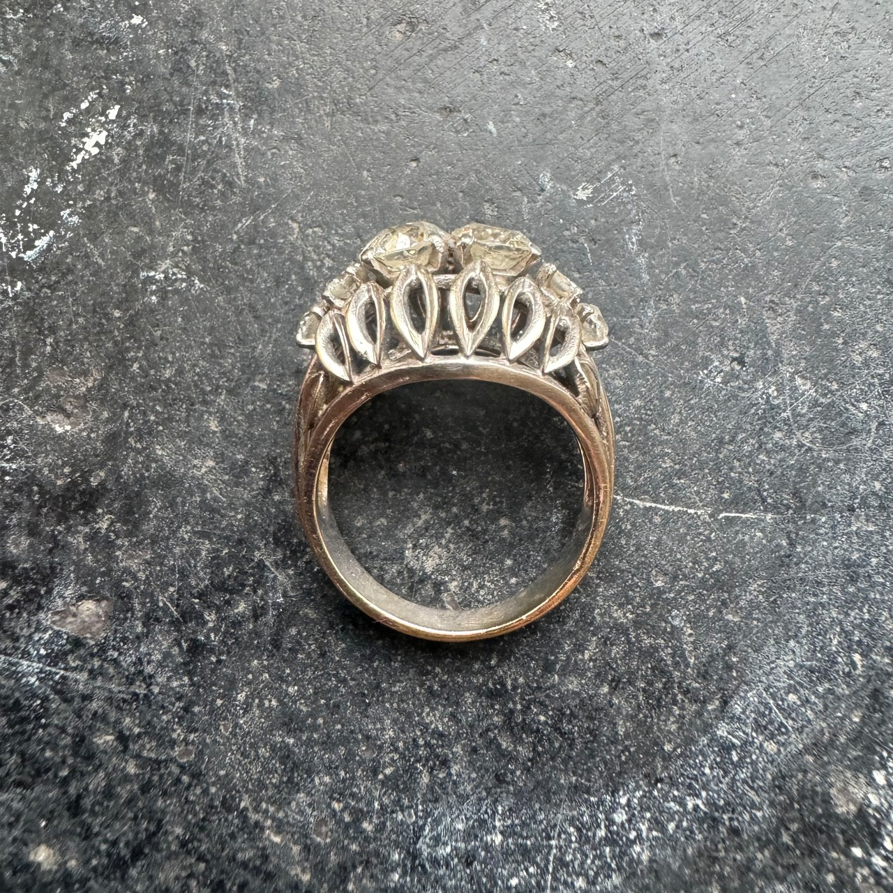 中心に2石大粒ダイヤモンド、オールドカットが施されたオープンワークのこちらのリングは当時の典型的なフレンチリングです。